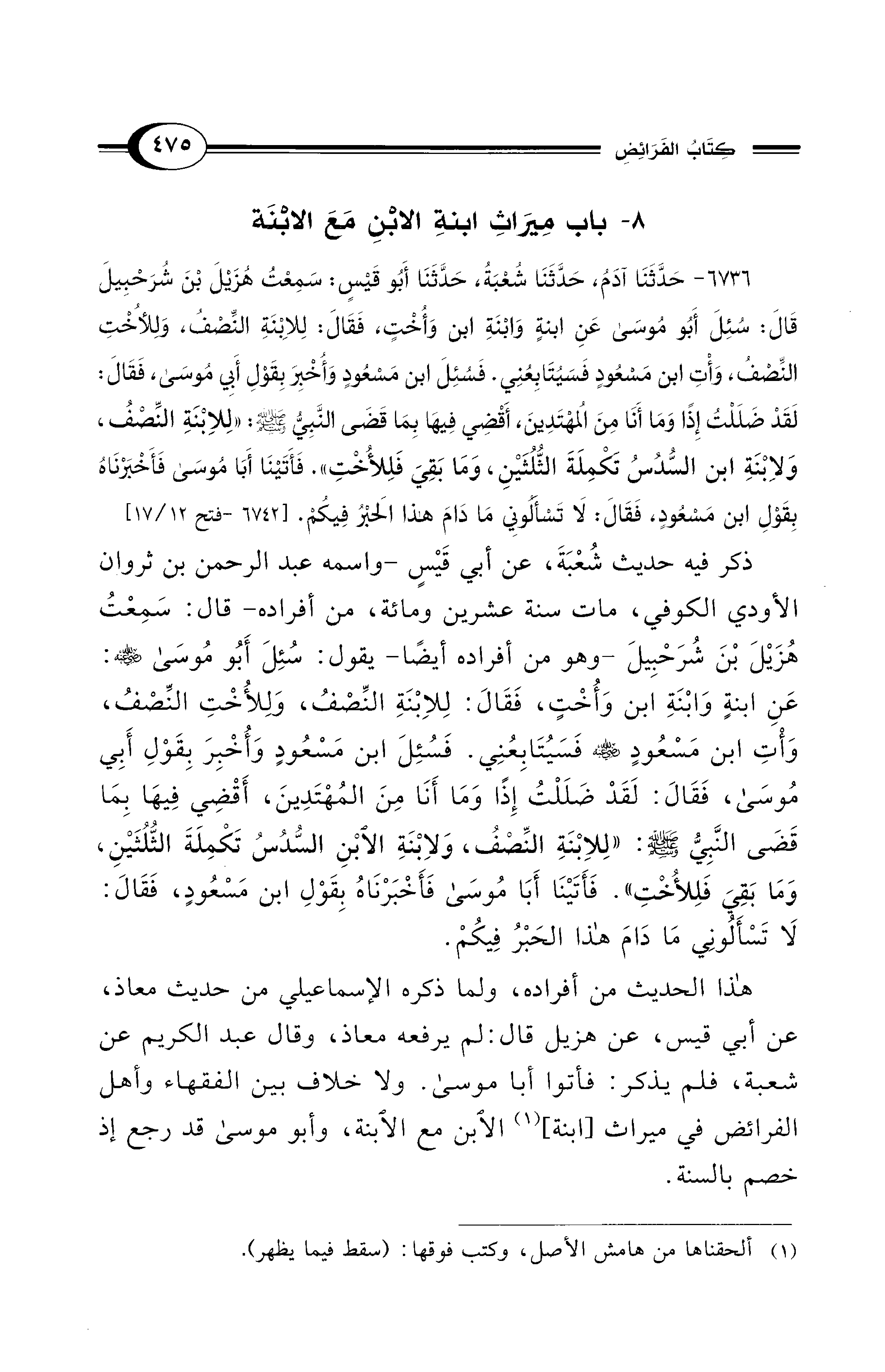 ذكر فيه حديث شُعْبَةَ، عن أبي قَيْسٍ -واسمه عبد الرحمن بن ثروان الأودي الكوفي، مات سنة عشرين ومائة، من أفراده- قال: سَمِعْتُ هُزَيْلَ بْنَ شُرَحْبِيلَ -وهو من أفراده أيضًا- يقول: سُئِلَ أَبُو مُوسَى - رضي الله عنه -: عَنِ ابنةٍ وَابْنَةِ ابن وَأُخْتٍ، فَقَالَ: لِلاِبْنَةِ النِّصفُ، وَلِلأُخْتِ النِّصْفُ، وَأْتِ ابن مَسْعُودٍ - رضي الله عنه - فَسَيُتَابِعُنِي. فَسُئِلَ ابن مَسْعُودٍ وَأُخْبِرَ بِقَوْلِ أَبِي مُوسَى، فَقَالَ: لَقَدْ ضَلَلْتُ إِذًا وَمَا أَنَا مِنَ المُهْتَدِينَ، أَقْضِي فِيهَا بِمَا قَضَى النَّبِيُّ - صلى الله عليه وسلم -: "لِلاِبْنَةِ النِّضفُ، وَلاِبْنَةِ الابْنِ السّدسُ تَكمِلَةَ الثُّلُثَيْنِ، وَمَا بَقِيَ فَلِلأخْتِ". فَأَتَيْنَا أَبَا مُوسَى فَأَخْبَرْنَاهُ بِقَوْلِ ابن مَسْعُودٍ، فَقَالَ: لَا تَسْأَلُونِي مَا دَامَ هذا الحَبْرُ فِيكُمْ.