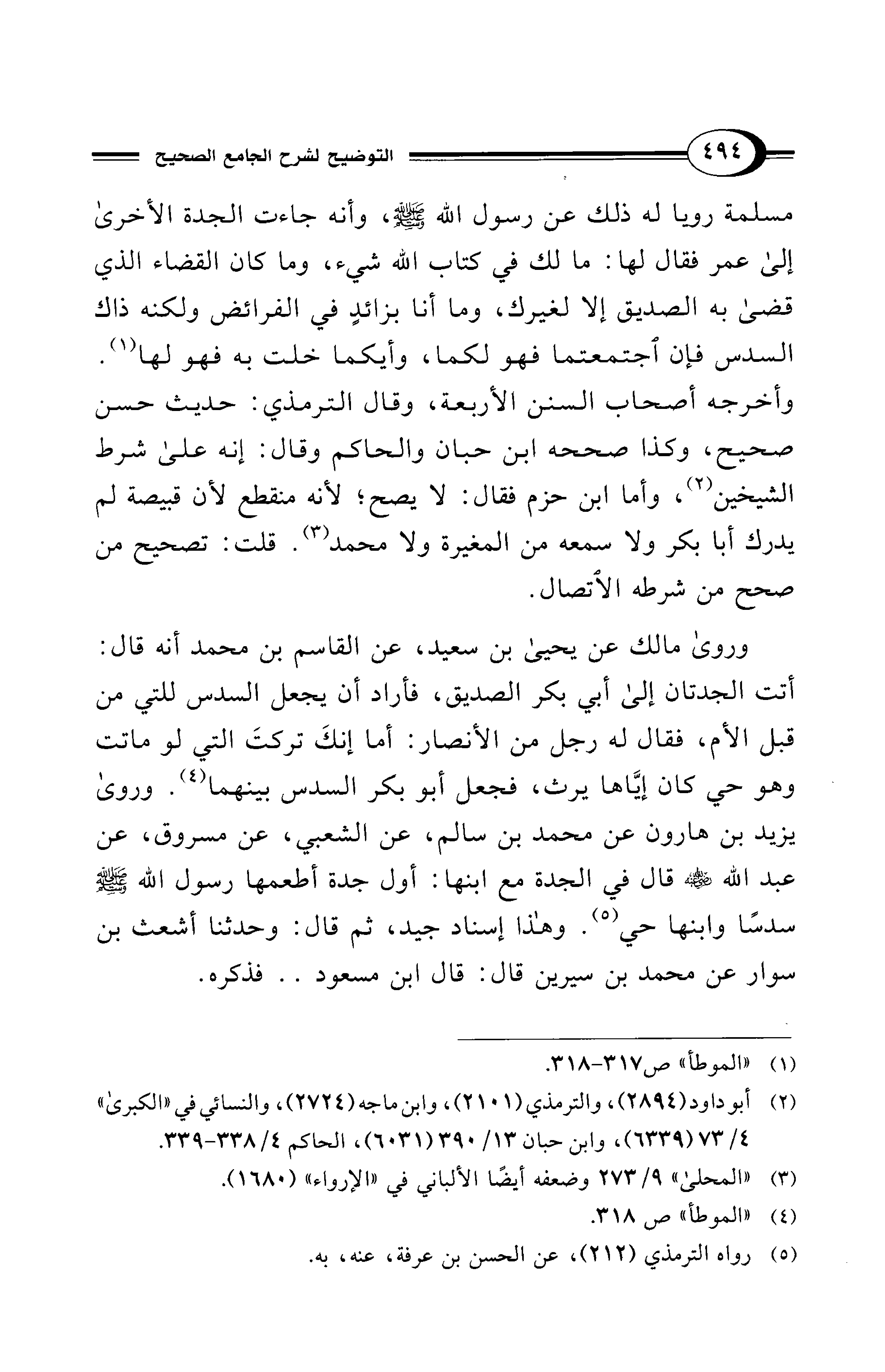 مسلمة رويا له ذلك عن رسول الله - صلى الله عليه وسلم -، وأنه جاءت الجدة الأخرى إلى عمر فقال لها: ما لك في كتاب الله شيء، وما كان القضاء الذي قضى به الصديق إلا لغيرك، وما أنا بزائدٍ في الفرائض ولكنه ذاك السدس فإن اجتمعتما فهو لكما، وأيكما خلت به فهو لها (¬1).