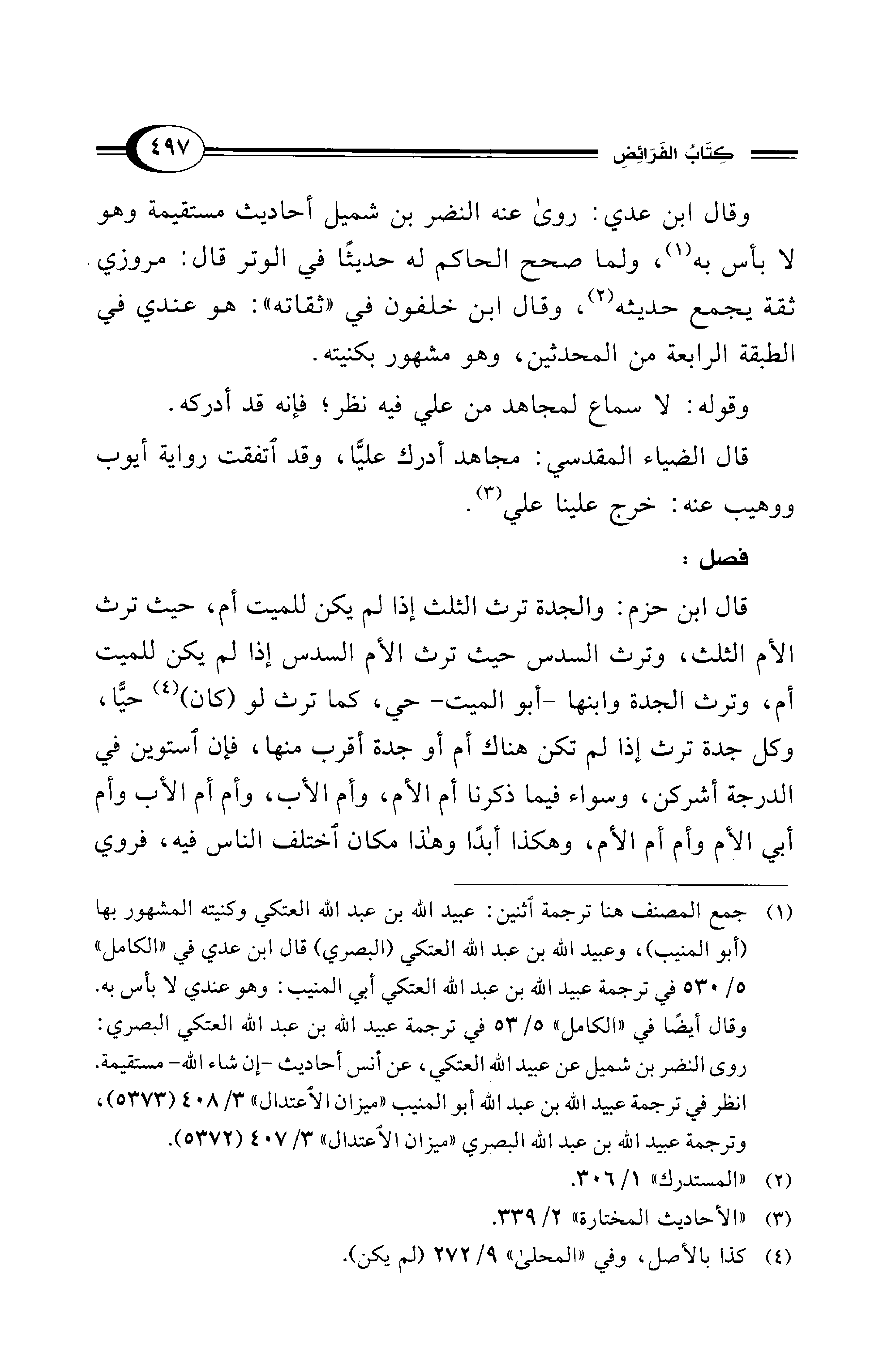 وقال ابن عدي: روى عنه النضر بن شميل أحاديث مستقيمة وهو لا بأس به (¬1)، ولما صحح الحاكم له حديثًا في الوتر قال: مروزي. ثقة يجمع حديثه (¬2)، وقال ابن خلفون في "ثقاته": هو عندي في الطبقة الرابعة من المحدثين، وهو مشهور بكنيته.