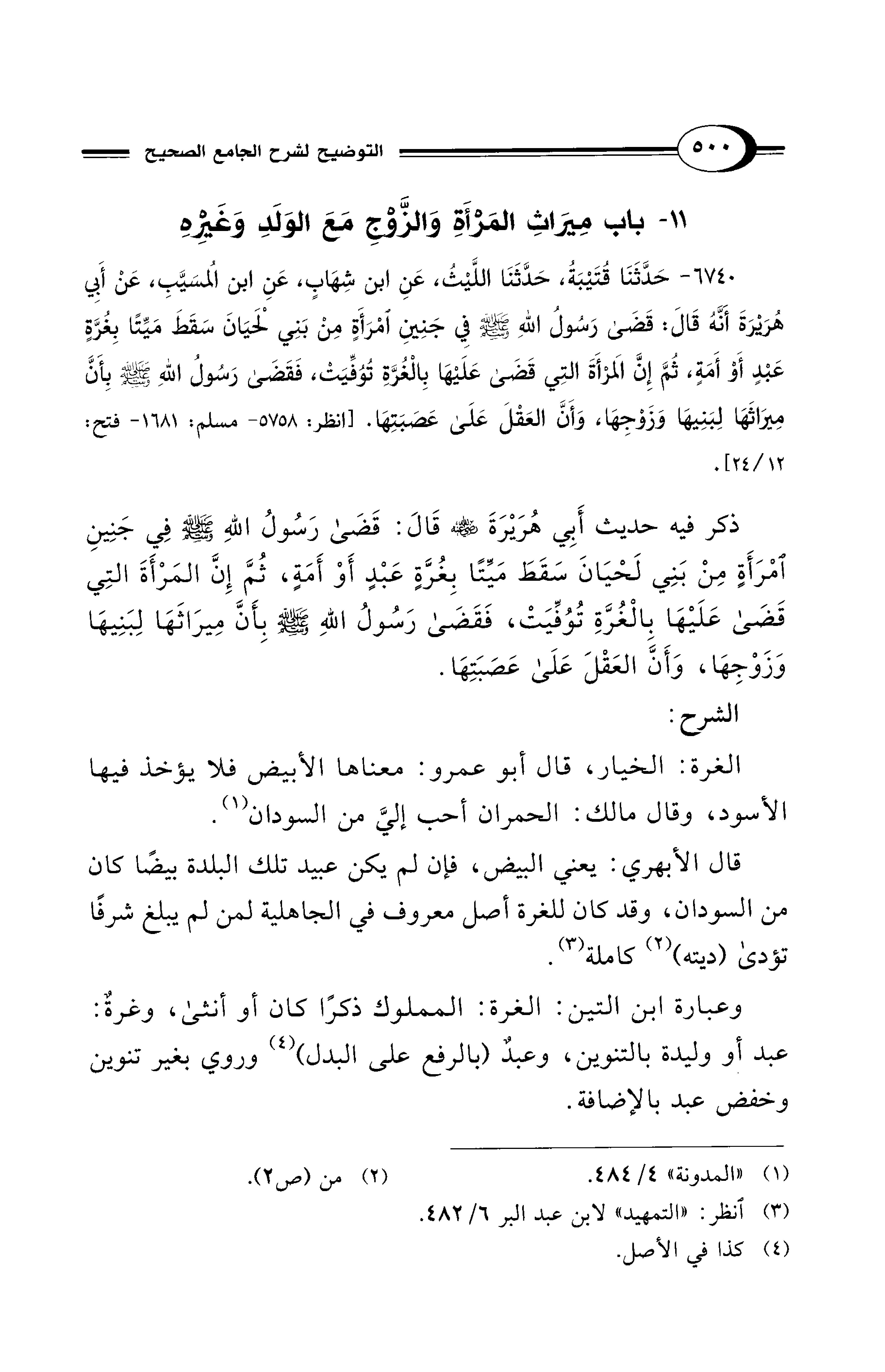 ذكر فيه حديث أَبِي هُرَيْرَةَ - رضي الله عنه - قَالَ: قَضَى رَسُولُ اللهِ - صلى الله عليه وسلم - فِي جَنِينِ امْرَأَةٍ مِنْ بَنِي لَحْيَانَ سَقَطَ مَيِّتًا بِغُرَّةٍ عَبْدٍ أَوْ أَمَةٍ، ثُمَّ إِنَّ المَرْأَةَ التِي قَضَى عَلَيْهَا بالْغُرَّةِ تُوُفِّيَتْ، فَقَضَى رَسُولُ اللهِ - صلى الله عليه وسلم- بِأَنَّ مِيرَاثَهَا لِبَنِيهَا وَزَوْجِهَا، وَأَنَّ العَقلَ عَلَى عَصَبَتِهَا.