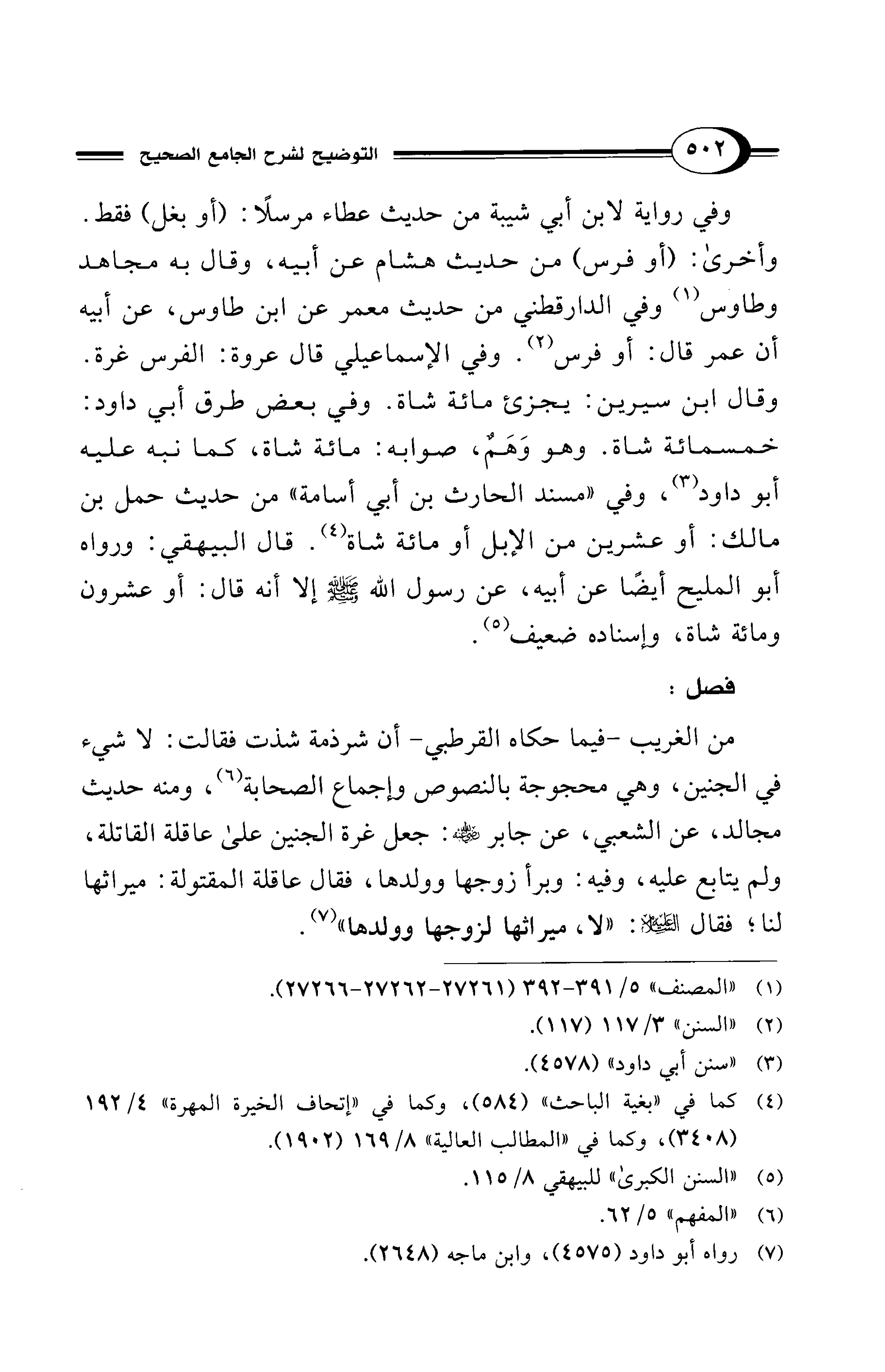 من الغريب -فيما حكاه القرطبي- أن شرذمة شذت فقالت: لا شيء في الجنين، وهي محجوجة بالنصوص وإجماع الصحابة (¬6)، ومنه حديث مجالد، عن الشعبي، عن جابر - رضي الله عنه -: جعل غرة الجنين على عاقلة القاتلة، ولم يتابع عليه، وفيه: وبرأ زوجها وولدها، فقال عا قلة المقتولة: ميراثها لنا؛ فقال - عليه السلام -: "لا، ميراثها لزوجها وولدها" (¬7).