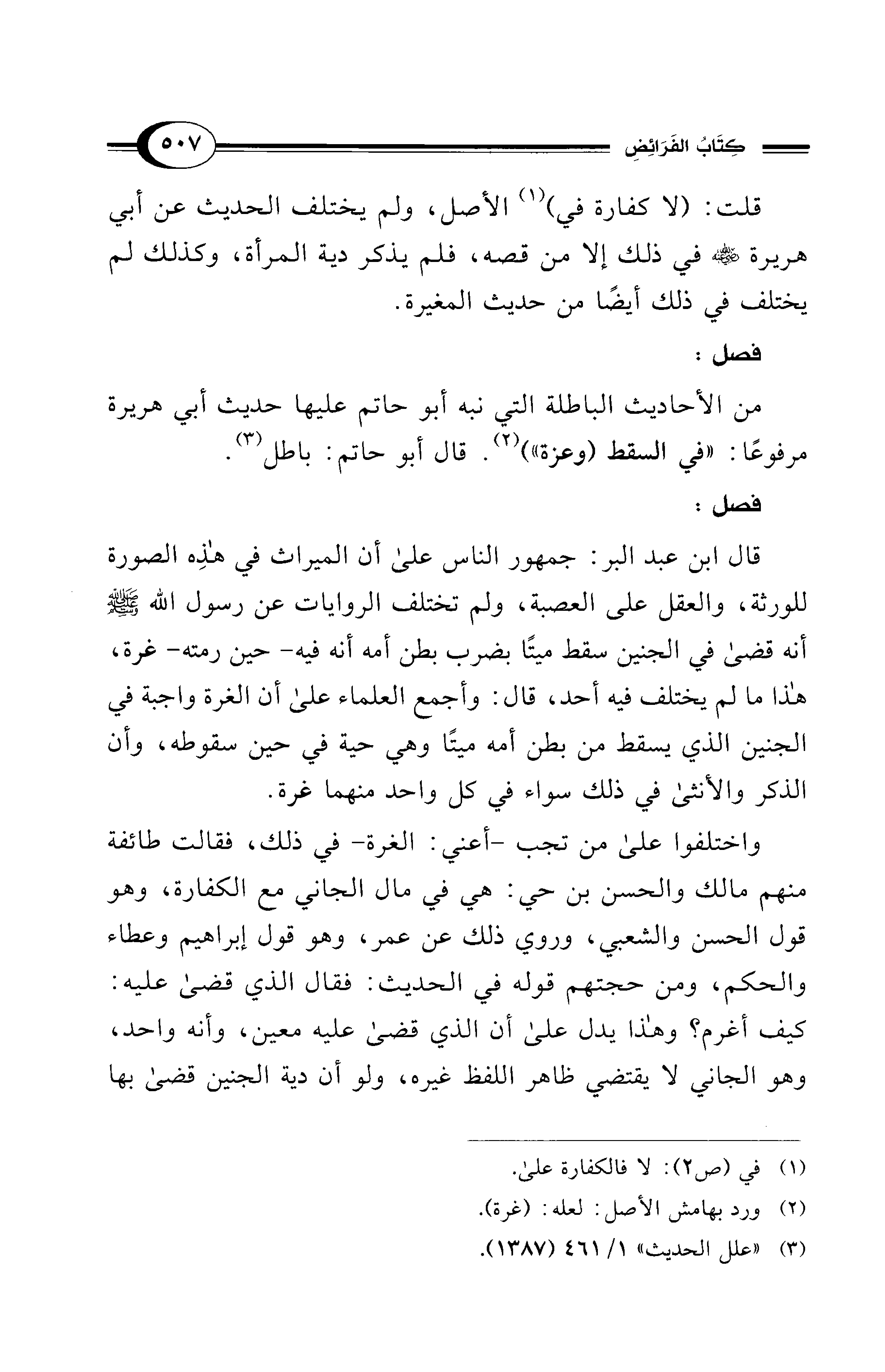 قال ابن عبد البر: جمهور الناس على أن الميراث في هذِه الصورة للورثة، والعقل على العصبة، ولم تختلف الروايات عن رسول الله - صلى الله عليه وسلم - أنه قضى في الجنين سقط ميتًا بضرب بطن أمه أنه فيه -حين رمته- غرة، هذا ما لم يختلف فيه أحد، قال: وأجمع العلماء على أن الغرة واجبة في الجنين الذي يسقط من بطن أمه ميتًا وهي حية في حين سقوطه، وأن الذكر والأنثى في ذلك سواء في كل واحد منهما غرة.