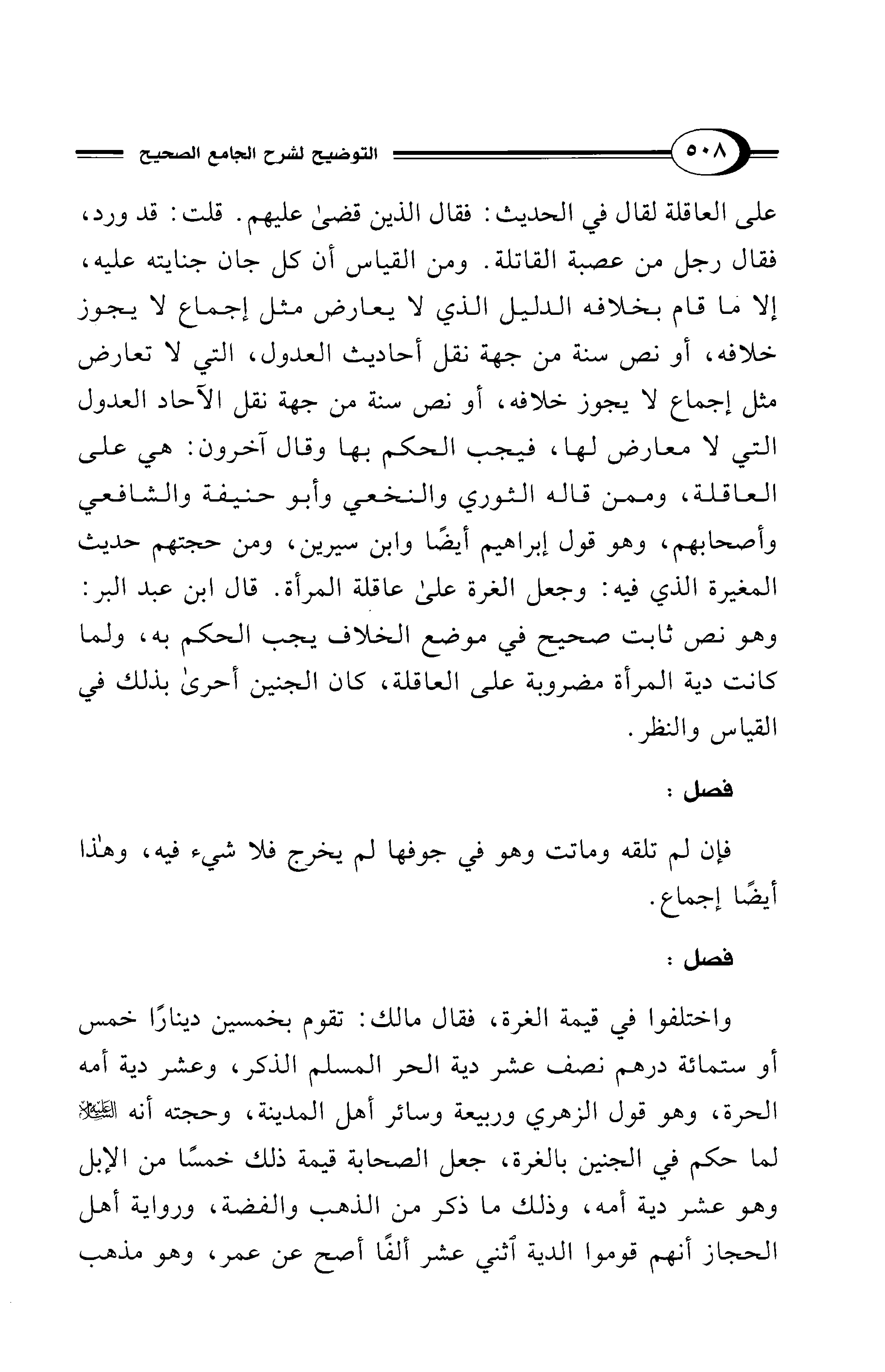 على العاقلة لقال في الحديث: فقال الذين قضى عليهم. قلت: قد ورد، فقال رجل من عصبة القاتلة. ومن القياس أن كل جان جنايته عليه، إلا ما قام بخلافه الدليل الذي لا يعارض مثل إجماع لا يجوز خلافه، أو0 نص سنة من جهة نقل أحاديث العدول، التي لا تعارض مثل إجماع لا يجوز خلافه، أو نص سنة من جهة نقل الآحاد العدول التي لا معارض لها، فيجب الحكم بها وقال آخرون: هي على العاقلة، وممن قاله الثوري والنخعي وأبو حنيفة والشافعي وأصحابهم، وهو قول إبراهيم أيضًا وابن سيرين، ومن حجتهم حديث المغيرة الذي فيه: وجعل الغرة على عاقلة المرأة. قال ابن عبد البر: وهو نص ثابت صحيح في موضع الخلاف يجب الحكم به، ولما كانت دية المرأة مضروبة على العاقلة، كان الجنين أحرى بذلك في القياس والنظر.