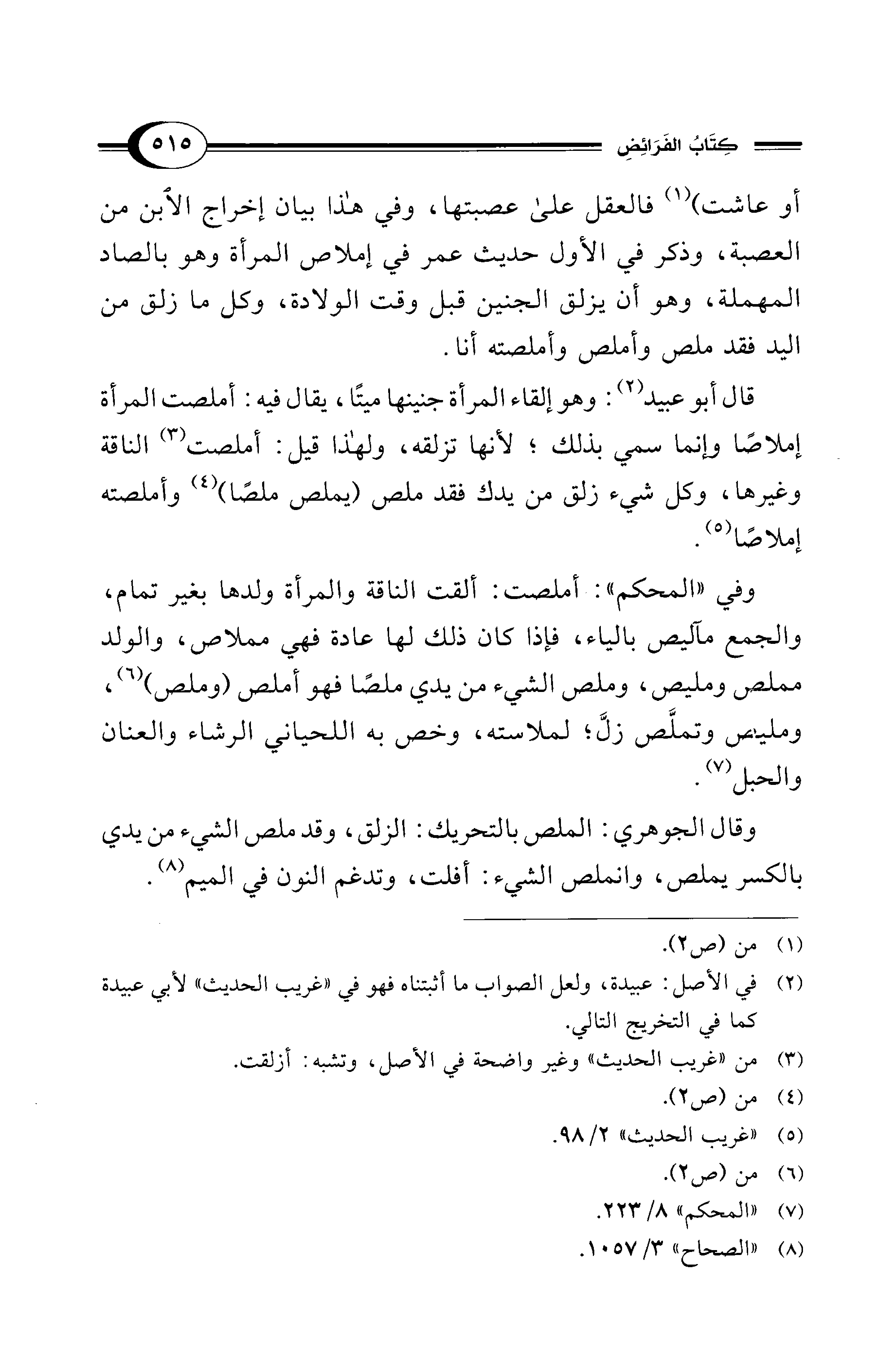 قال أبو عبيد (¬2): وهو إلقاء المرأة جنينها ميتًا، يقال فيه: أملصت المرأة إملاصًا وإنما سمي بذلك؛ لأنها تزلقه، ولهذا قيل: أملصت (¬3) الناقة وغيرها، وكل شيء زلق من يدك فقد ملص (يملص ملصًا) (¬4) وأملصته إملاصًا (¬5).