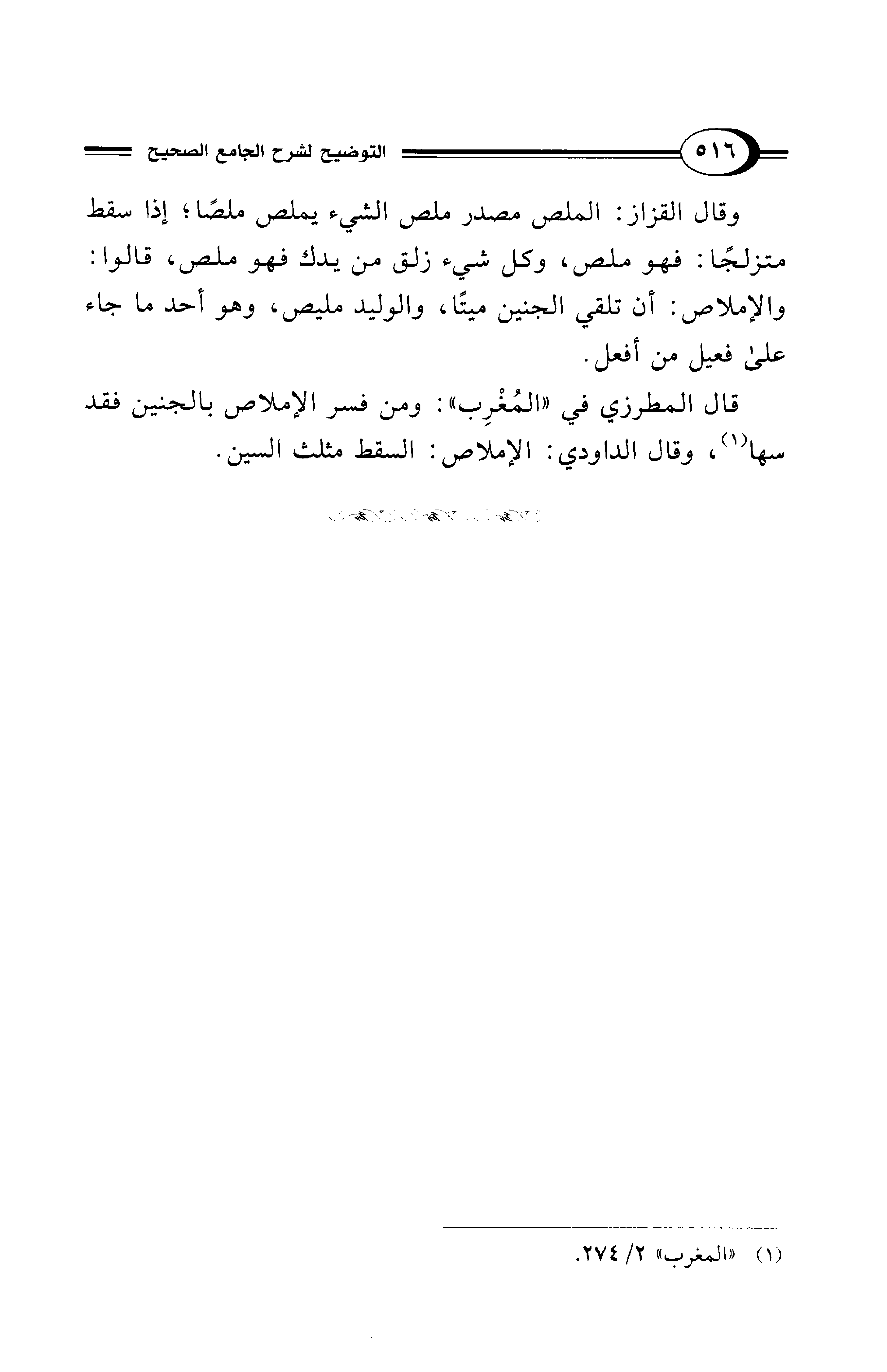 وقال القزاز: الملص مصدر ملص الشيء يملص؛ إذا سقط متزلجًا: فهو ملص، وكل شيء زلق من يدك فهو ملص، قالوا: والإملاص: أن تلقي الجنين ميتًا، والوليد مليص، وهو أحد ما جاء على فعيل من أفعل.
