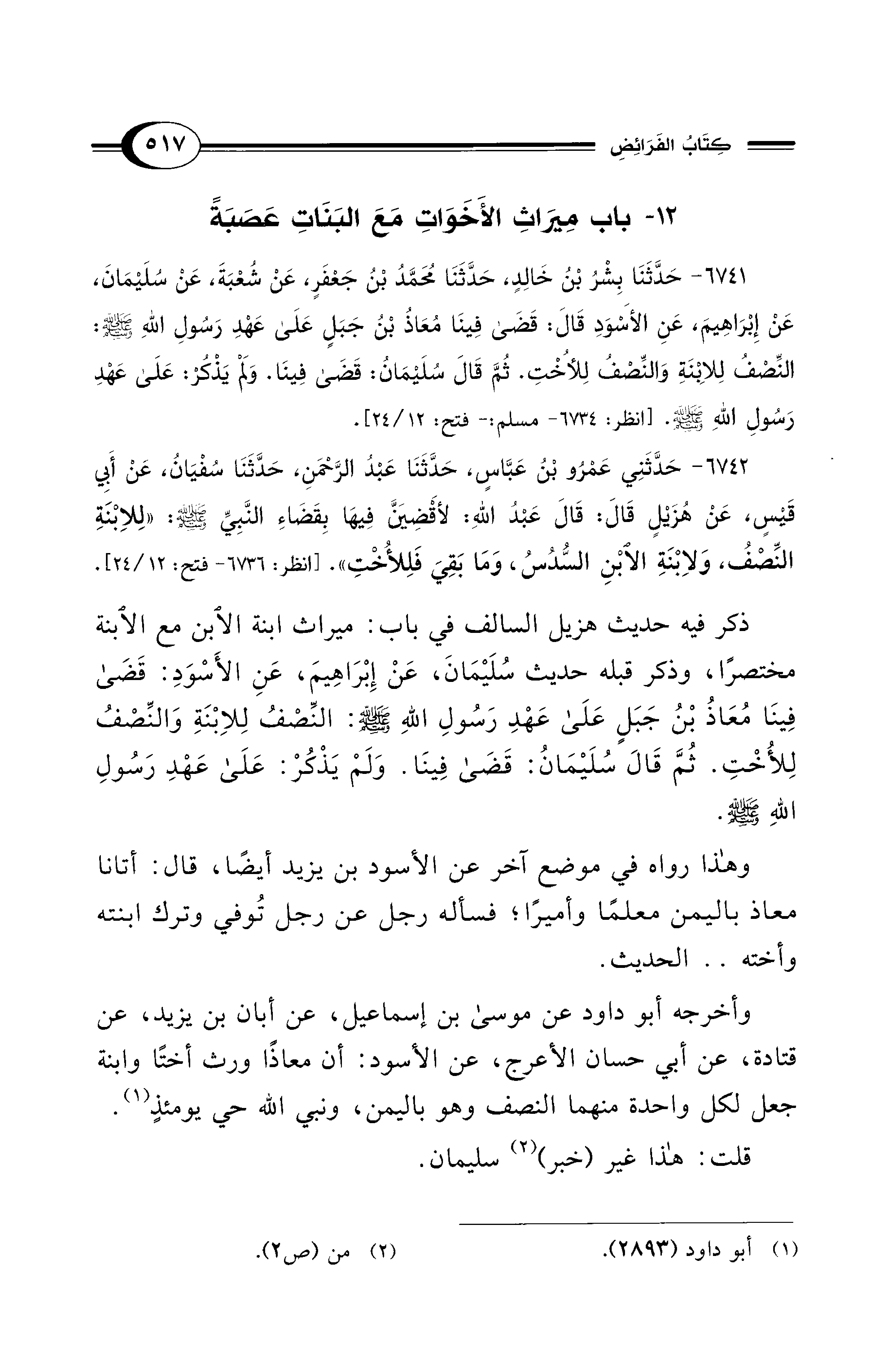 6741 - حَدَّثَنَا بِشْرُ بْنُ خَالِدٍ، حَدَّثَنَا مُحَمَّدُ بْنُ جَعْفَرٍ، عَنْ شُعْبَةَ، عَنْ سُلَيْمَانَ، عَنْ إِبْرَاهِيمَ، عَنِ الأَسْوَدِ قَالَ: قَضَى فِينَا مُعَاذُ بْنُ جَبَلٍ عَلَى عَهْدِ رَسُولِ اللهِ - صلى الله عليه وسلم - النِّصْفُ لِلاِبْنَةِ وَالنِّصْفُ لِلأُخْتِ. ثُمَّ قَالَ سُلَيْمَانُ قَضَى فِينَا. وَلَمْ يَذْكُرْ: عَلَى عَهْدِ رَسُولِ اللهِ - صلى الله عليه وسلم -. [انظر: 6734 - مسلم:- فتح: 12/ 24].