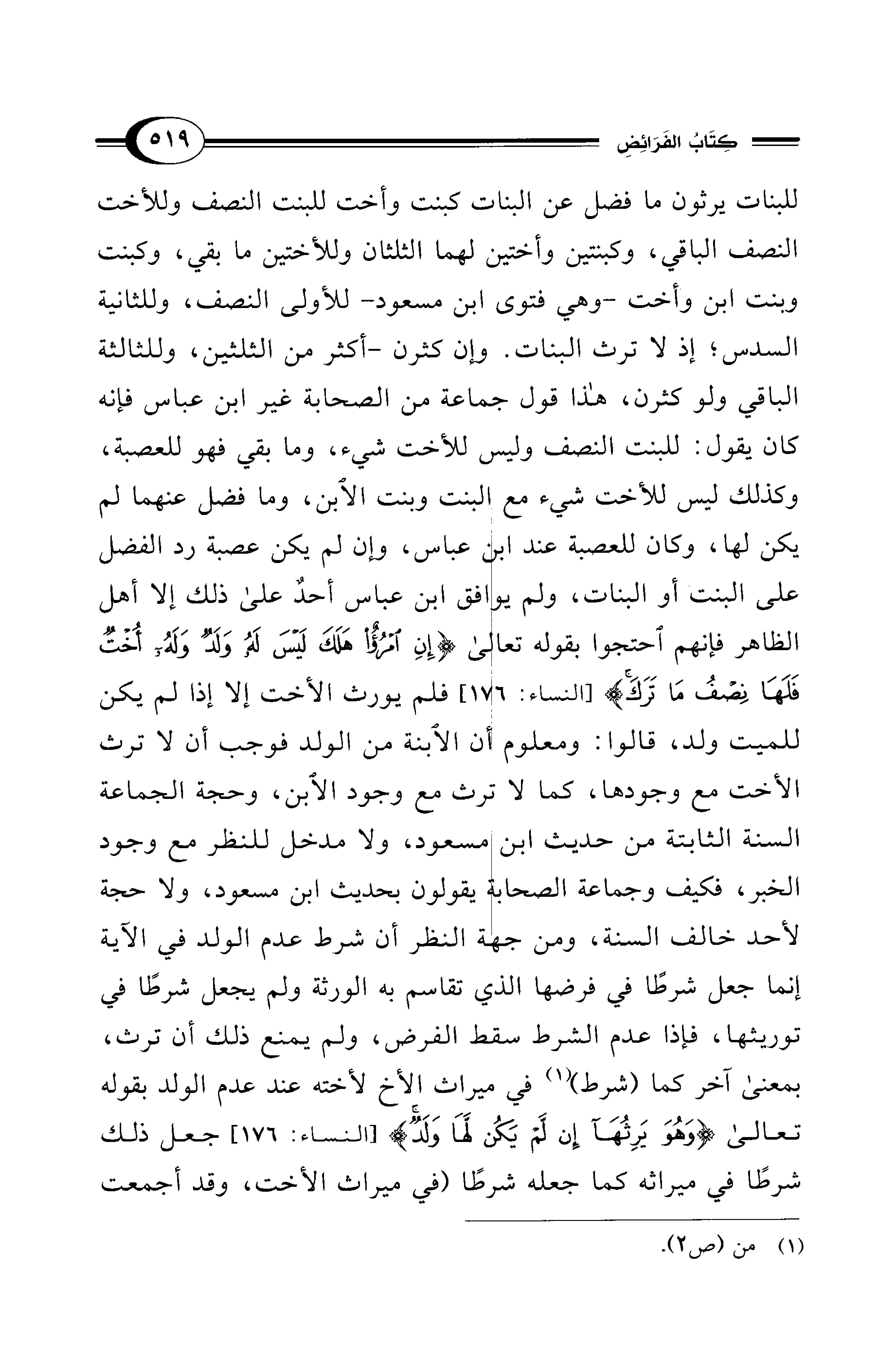 للبنات يرثون ما فضل عن البنات كبنت وأخت للبنت النصف وللأخت النصف الباقي، وكبنتين وأختين لهما الثلثان وللأختين ما بقي، وكبنت وبنت ابن وأخت -وهي فتوى ابن مسعود- للأولى النصف، وللثانية السدس؛ إذ لا ترث البنات. وإن كثرن -أكثر من الثلثين، وللثالثة الباقي ولو كثرن، هذا قول جماعة من الصحابة غير ابن عباس فإنه كان يقول: للبنت النصف وليس للأخت شيء، وما بقي فهو للعصبة، وكذلك ليس للأخت شيء مع البنت وبنت الابن، وما فضل عنهما لم يكن لها، وكان للعصبة عند ابن عباس، وإن لم يكن عصبة رد الفضل على البنت أو البنات، ولم يوافق ابن عباس أحدٌ على ذلك إلا أهل الظاهر فإنهم احتجوا بقوله تعالى {إِنِ امْرُؤٌ هَلَكَ لَيْسَ لَهُ وَلَدٌ وَلَهُ أُخْتٌ فَلَهَا نِصْفُ مَا تَرَكَ} [النساء: 176] فلم يورث الأخت إلا إذا لم يكن للميت ولد، قالوا: ومعلوم أن الابنة من الولد فوجب أن لا ترث الأخت مع وجودها، كما لا ترث مع وجود الابن، وحجة الجماعة السنة الثابتة من حديث ابن مسعود، ولا مدخل للنظر مع وجود الخبر، فكيف وجماعة الصحابة يقولون بحديث ابن مسعود، ولا حجة لأحد خالف السنة، ومن جهة النظر أن شرط عدم الولد في الآية إنما جعل شرطًا في فرضها الذي تقاسم به الورثة ولم يجعل شرطًا في توريثها، فإذا عدم الشرط سقط الفرض، ولم يمنع ذلك أن ترث، بمعنى آخر كما (شرط) (¬1) في ميراث الأخ لأخته عند عدم الولد بقوله تعالى {وَهُوَ يَرِثُهَا إِنْ لَمْ يَكُنْ لَهَا وَلَدٌ} [النساء: 176] جعل ذلك شرطًا في ميراثه كما جعله شرطًا (في ميراث الأخت، وقد أجمعت