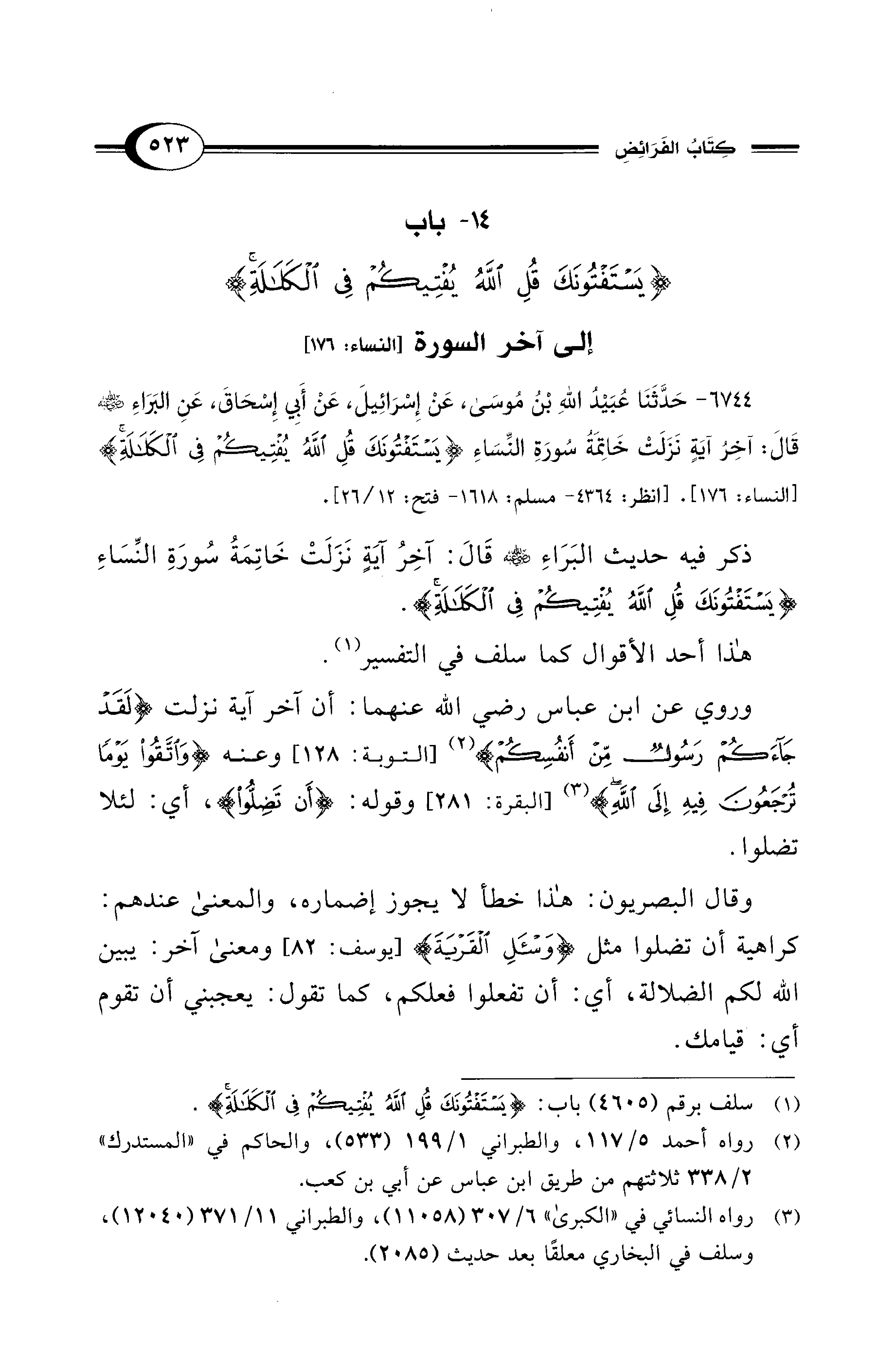 ذكر فيه حديث البَرَاءِ - رضي الله عنه - قَالَ: آخِرُ آيَةٍ نَزَلَتْ خَاتِمَةُ سُورَةِ النِّسَاءِ {يَسْتَفْتُونَكَ قُلِ اللهُ يُفْتِيكُمْ فِي الْكَلَالَةِ}.
