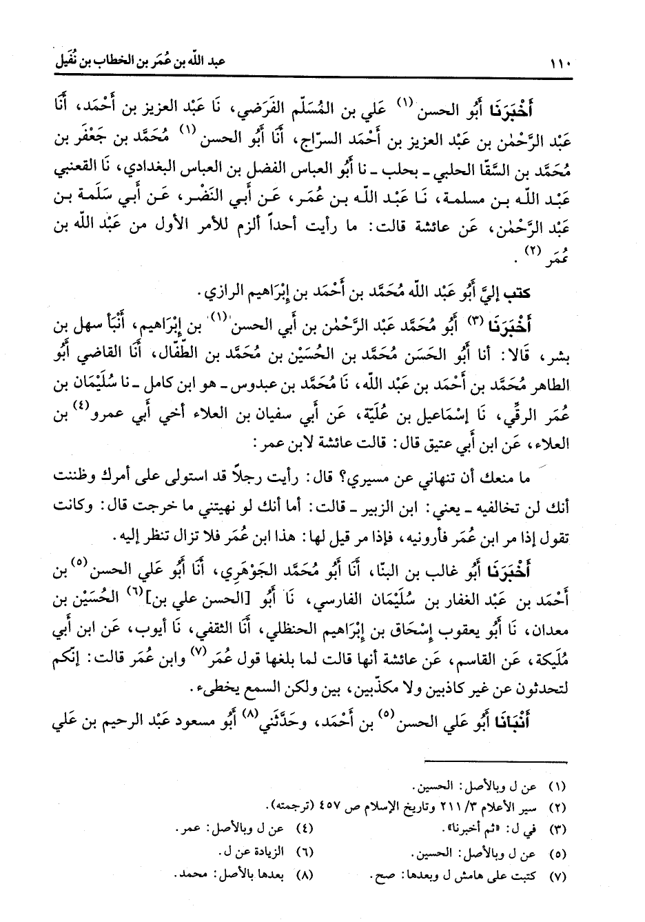 أخبرنا أبو الحسن (1) علي بن المسلم الفرضي نا عبد العزيز بن أحمد أنا عبد الرحمن بن عبد العزيز بن أحمد السراج أنا أبو الحسن (1) محمد بن جعفر بن محمد بن السقا الحلبي بحلب نا أبو العباس الفضل بن العباس البغدادي نا القعنبي عبد الله بن مسلمة نا عبد الله بن عمر عن أبي النضر عن أبي سلمة بن عبد الرحمن عن عائشة قالت ما رأيت أحدا ألزم للأمر الأول من عبد الله بن عمر (2) كتب إلي أبو عبد الله محمد بن أحمد بن إبراهيم الرازي أخبرنا (3) أبو محمد عبد الرحمن بن أبي الحسن (1) بن إبراهيم أنبأ سهل بن بشر قالا أنا أبو الحسن محمد بن الحسين بن محمد بن الطفال أنا القاضي أبو الطاهر محمد بن أحمد بن عبد الله نا محمد بن عبدوس هو ابن كامل نا سليمان بن عمر الرقي نا إسماعيل بن علية عن أبي سفيان بن العلاء أخي أبي عمرو (4) بن العلاء عن ابن أبي عتيق قال قالت عائشة لابن عمر ما منعك أن تنهاني عن مسيري قال رأيت رجلا قد استولى على أمرك وظننت أنك تخالفيه يعني ابن الزبير قالت أما أنك لو نهيتني ما خرجت قال وكانت تقول إذا مر ابن عمر فأرونيه فإذا مر قيل لها هذا ابن عمر فلا تزال تنظر إليه أخبرنا أبو غالب بن البنا أنا أبو محمد الجوهري أنا أبو علي الحسن (5) بن أحمد بن عبد الغفار بن سليمان الفارسي نا أبو الحسن علي بن (6) الحسين بن معدان نا أبو يعقوب إسحاق بن إبراهيم الحنظلي أنا الثقفي نا أيوب عن ابن أبي مليكة عن القاسم عن عائشة أنها قالت لما بلغها قول عمر (7) وابن عمر قالت إنكم لتحدثون عن غير كاذبين ولا مكذبين بين ولكن السمع يخطئ أنبأنا أبو علي الحسن (5) بن أحمد وحدثني (8) أبو مسعود عبد الرحيم بن علي