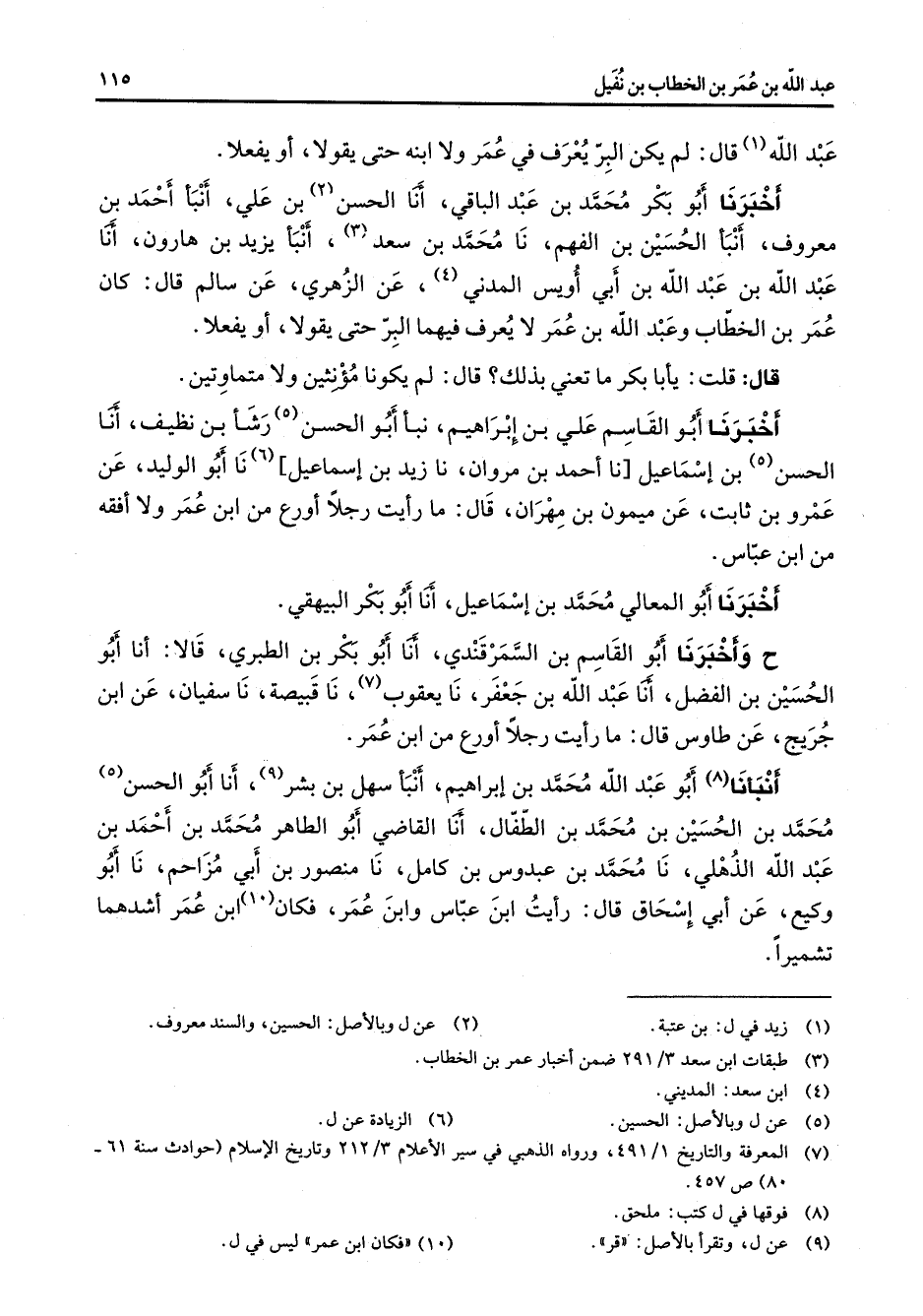 عبد الله (1) قال لم يكن البر يعرف في عمر ولا ابنه حتى يقولا أو يفعلا أخبرنا أبو بكر محمد بن عبد الباقي أنا الحسن (2) بن علي أنبأ أحمد بن معروف أنبأ الحسين بن الفهم نا محمد بن سعد (3) أنبأ يزيد بن هارون أنا عبد الله بن عبد الله بن أبي أويس المدني (4) عن الزهري عن سالم قال كان عمر بن الخطاب وعبد الله بن عمر لا يعرف فيهما البر حتى يقولا أو يفعلا قال قلت يا أبا بكر ما تعني بذلك قال لم يكونا مؤنثين ولا متماوتين أخبرنا أبو القاسم علي بن إبراهيم نبأ أبو الحسن (5) رشأ بن نظيف أنا الحسن (5) بن إسماعيل نا أحمد بن مروان نا زيد بن إسماعيل (6) نا أبو الوليد عن عمرو بن ثابت عن ميمون بن مهران قال ما رايت رجلا أورع من ابن عمر ولا أفقه من ابن عباس أخبرنا أبو المعالي محمد بن إسماعيل أنا أبو بكر البيهقي ح وأخبرنا أبو القاسم بن السمرقندي أنا أبو بكر بن الطبري قالا أبو أبو الحسين بن الفضل أنا عبد الله بن جعفر نا يعقوب (7) نا قبيصة نا سفيان عن ابن جريج عن طاوس قال ما رايت رجلا أورع من ابن عمر أنبأنا (8) أبو عبد الله محمد بن إبراهيم أنبأ سهل بن بشر (9) أنا أبو الحسن (5) محمد بن الحسين بن محمد بن الطفال أنا القاضي أبو الطاهر محمد بن أحمد بن عبد الله الذهلي نا محمد بن عبدوس بن كامل نا منصور بن أبي مزاحم نا أبو وكيع عن أبي إسحاق قال رأيت ابن عباس وابن عمر فكان (10) ابن عمر أشدهما تشميرا