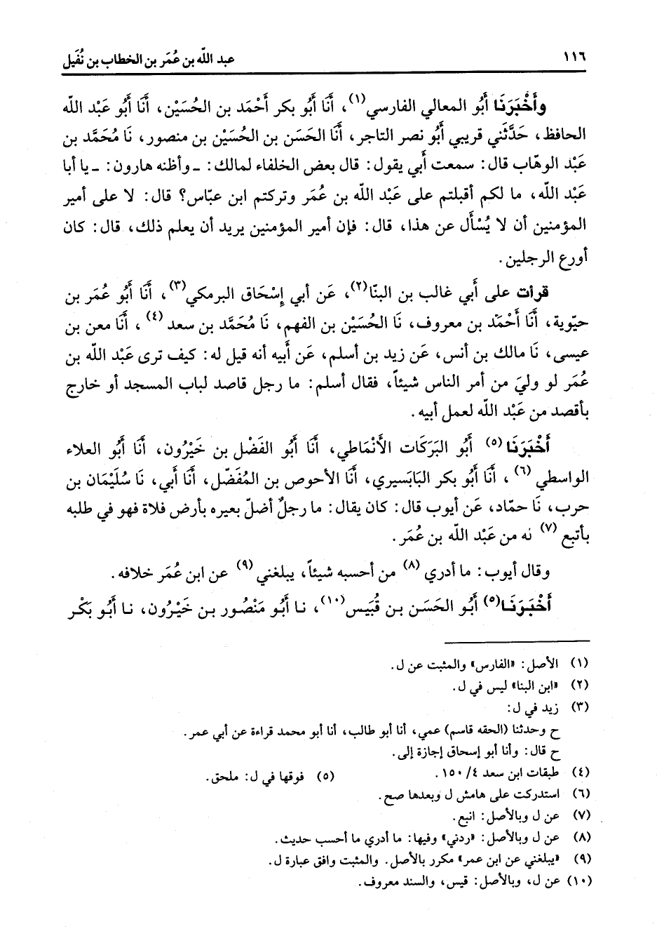 وأخبرنا أبو المعالي الفارسي (1) أنا أبو بكر أحمد بن الحسين أنا أبو عبد الله الحافظ حدثني قريبي أبو نصر التاجر أنا الحسن بن الحسين بن منصور نا محمد بن عبد الوهاب قال سمعت أبي يقول قال بعض الخلفاء لمالك وأظنه هارون يا أبا عبد الله ما لكم أقبلتم علي عبد الله بن عمر وتركتم ابن عباس قال لا على أمير المؤمنين أن لا يسأل عن هذا قال فإن أمير المؤمنين يريد أن يعلم ذلك قال كان أورع الرجلين قرأت على أبي غالب بن البنا (2) عن أبي إسحاق البرمكي (3) أنا أبو عمر بن حيوية أنا أحمد بن معروف نا الحسين بن الفهم نا محمد بن سعد (4) أنا معن بن عيسى نا مالك بن أنس عن زيد بن أسلم عن أبيه أنه قيل له كيف ترى عبد الله بن عمر لو ولي من أمر الناس شيئا فقال اسلم ما رجل قاصد لباب المسجد أو خارج بأقصد من عبد الله لعمل أبيه أخبرنا (5) أبو البركات الأنماطي أنا أبو الفضل بن خيرون أنا أبو العلاء الواسطي (6) أنا أبو بكر البابسري أنا الأحوص بن المفضل أنا أبي نا سليمان بن حرب نا حماد عن أيوب قال كان يقال ما رجل أضل بعيره بارض فلاة فهو في طلبه بأتبع (7) له من عبد الله بن عمر وقال أيوب ما أدري (8) من أحسبه شيئا يبلغني (9) عن ابن عمر خلافه أخبرنا أبو الحسن بن قبيس (10) نا أبو منصور بن خيرون نا أبو بكر