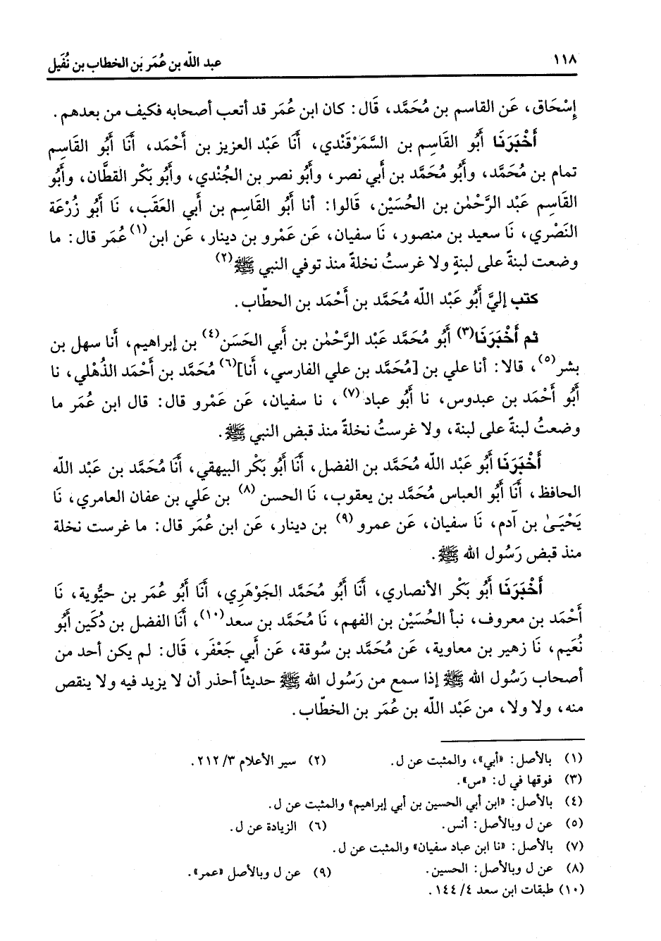 إسحاق عن القاسم بن محمد قال كان ابن عمر قد أتعب أصحابه فكيف من بعدهم أخبرنا أبو القاسم بن السمرقندي أنا عبد العزيز بن أحمد أنا أبو القاسم تمام بن محمد وأبو محمد بن أبي نصر وأبو نصر بن الجندي وأبو بكر القطان وأبو القاسم عبد الرحمن بن الحسين قالوا أنا أبو القاسم بن أبي العقب نا أبو زرعة النصري نا سعيد بن منصور نا سفيان عن عمرو بن دينار عن ابن (1) عمر قال ما وضعت لبنة على لبنة ولا غرست نخلة منذ توفي النبي (صلى الله عليه وسلم) (2) كتب إلي أبو عبد الله محمد بن أحمد بن الحطاب ثم أخبرنا (3) أبو محمد عبد الرحمن بن أبي الحسن (4) بن إبراهيم أنا سهل بن بشر (5) قالا أنا علي بن محمد بن علي الفارسي أنا (6) محمد بن أحمد الذهلي نا أبو أحمد بن عبدوس نا أبو عباد (7) نا سفيان عن عمرو قال قاتل ابن عمر ما وضعت لبنة ولا غرست نخلة منذ قبض النبي (صلى الله عليه وسلم) أخبرنا أبو عبد الله محمد بن الفضل أنا أبو بكر البيهقي أنا محمد بن عبد الله الحافظ أنا أبو العباس محمد بن يعقوب نا الحسن (8) بن علي بن عفان العامري نا يحيى بن آدم نا سفيان عن عمرو (9) بن دينار عن ابن عمر قال ما غرست نخلة منذ قبض النبي (صلى الله عليه وسلم) أخبرنا أبو بكر الأنصاري أنا أبو محمد الجوهري أنا أبو عمر بن حيوية نا أحمد بن معروف نبأ الحسين بن الفهم نا محمد بن سعد (10) أنا الفضل بن دكين أبو نعيم نا زهير بن معاوية عن محمد بن سوقة عن أبي جعفر قال لم يكن أحد من أصحاب رسول الله (صلى الله عليه وسلم) إذا سمع من رسول الله حديثا أحذر أن لا يزيد فيه ولا ينقص منه ولا ولا من عبد الله بن عمر بن الخطاب