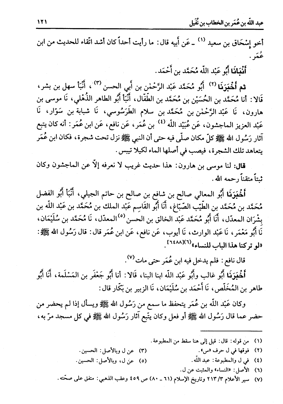 أخو إسحاق بن سعيد (1) عن أبيه قال ما رأيت أحدا كان أشد اتقاء للحديث من ابن عمر أنبأنا أبو عبد الله محمد بن أحمد ثم أخبرنا (2) أبو محمد عبد الرحمن بن أبي الحسن (3) أنبأ سهل بن بشر قالا أنا محمد بن الحسين بن محمد بن الطفال أنبأ أبو الطاهر الذهلي نا موسى بن هارون نا عبد الرحمن بن محمد بن سلام الطرسوسي نا شبابة بن سوار نا عبد العزيز الماجشون عن عبيد الله (4) بن عمر عن نافع عن ابن عمر أنه كان يتبع آثار رسول الله (صلى الله عليه وسلم) كل مكان صلى فيه حتى أن النبي (صلى الله عليه وسلم) نزل تحت شجرة فكان ابن عمر يتعاهد تلك الشجرة فيصب في أصلها الماء لكيلا تيبس قال لنا موسى بن هارون رحمه الله هذا حديث غريب لا نعرفه إلا عن الماجشون وكان ثبتا متقنا رحمه الله أخبرنا أبو المعالي صالح بن شافع بن صالح بن حاتم الجيلي أنبأ أبو الفضل محمد بن محمد بن الطيب الصباغ أنا أبو القاسم عبد الملك بن محمد بن عبد الله بن بشران المعدل أنا أبو محمد عبد الخالق بن الحسن (5) المعدل نا محمد بن سليمان نا أبو معمر نا عبد الوارث نا أيوب عن نافع عن ابن عمر قال قال رسول الله (صلى الله عليه وسلم) لو تركنا هذا الباب للنساء (6) قال نافع فلم يدخل فيه ابن عمر حتى مات (7) أخبرنا أبو غالب وابو عبد الله بن البنا قالا أنا أبو جعفر بن المسلمة أنا أبو طاهر بن المخلص نا أحمد بن سليمان نا الزبير بن بكار قال وكان عبد الله بن عمر يتحفظ ما سمع من رسول الله (صلى الله عليه وسلم) أو فعل وكان يتبع آثار رسول الله (صلى الله عليه وسلم) في كل مسجد مر به