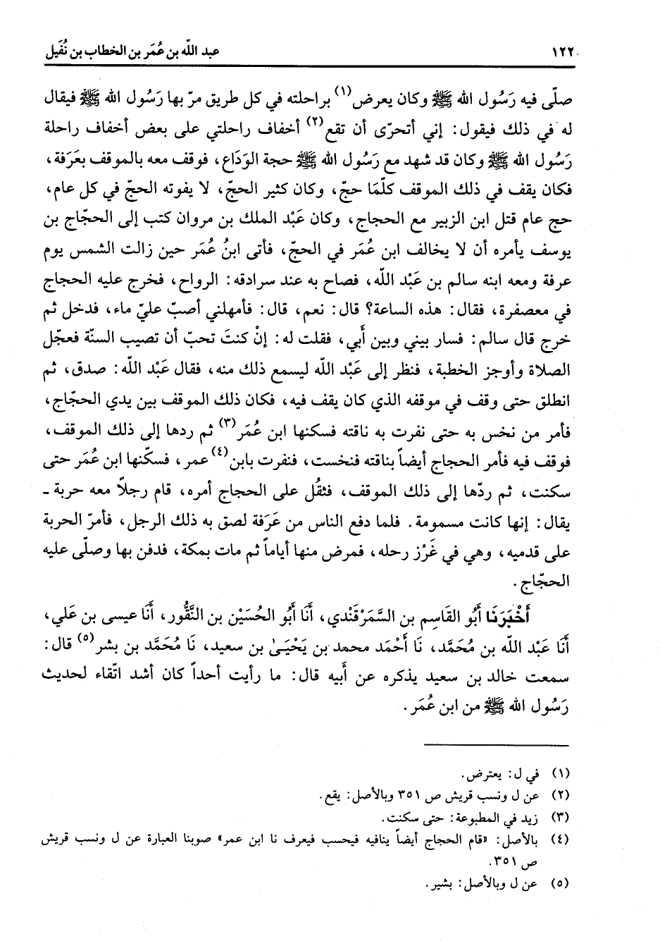 صلى فيه رسول الله (صلى الله عليه وسلم) وكان يعرض (1) براحلته في كل طريق مر بها رسول الله (صلى الله عليه وسلم) فيقال له في ذلك في فيقول إني أتحرى أن تقع (2) اخفاف راحلتي على بعض أخفاف رسول الله (صلى الله عليه وسلم) وكان قد شهد مع رسول الله (صلى الله عليه وسلم) حجة الوداع فوقف معه بالموقف بعرفة فكان يقف في ذلك الموقف كلما حج وكان كثير الحج لا يفوته الحج كل عام حج عام قتل الزبير مع الحجاج وكان عبد الملك بن مروان كتب إلى الحجاج بن يوسف يأمره أن لا يخالف ابن عمر في الحج فأتى ابن عمر حين زالت الشمس يوم عرفة ومعه ابنه سالم بن عبد الله فصاح به عند سرداقة الرواح فخرج عليه الحجاج في معصفرة فقال هذه الساعة قال نعم قال فأهملني أصب علي ماء فدخل ثم خرج قال سالم فسار بيني وبين أبي فقلت له إن كنت تحب أن تصيب السنة فعجل الصلاة وأوجز الخطبة فنظر إلى عبد الله ليسمع ذلك منه فقال عبد الله صدق ثم انطلق حتى وقف في موقفه الذي كان يقف فيه فكان ذلك الموقف بين يدي الحجاج فأمر من نخس به حتى نفرت به ناقته فسكنها ابن عمر (3) ثم ردها إلى ذلك الموقف فوقف فيه فأمر الحجاج أيضا بناقته فنخست فنفرت بابن (4) عمر فسكنها ابن عمر حتى سكنت ثم ردها الى ذلك الموقف فثقل على الحجاج أمره قال رجلا معه حربة يقال إنها كانت مسمومة فلما دفع الناس من عرفة لصق بها ذلك الرجل فأمر الحربة على قدميه وهي في غرز رحله فمرض منها أياما ثم مات بمكة فدفن بها وصلى عليه الحجاج أخبرنا أبو القاسم بن السمرقندي أنا أبو الحسين بن النقور أنا عيسى بن علي أنا عبد الله بن محمد نا أحمد محمد بن يحيى بن سعيد نا محمد بن بشر (5) قال سمعت خالد بن سعيد يذكره عن أبيه قال ما رأيت أحدا كان أشد اتقاء لحديث رسول الله من ابن عمر