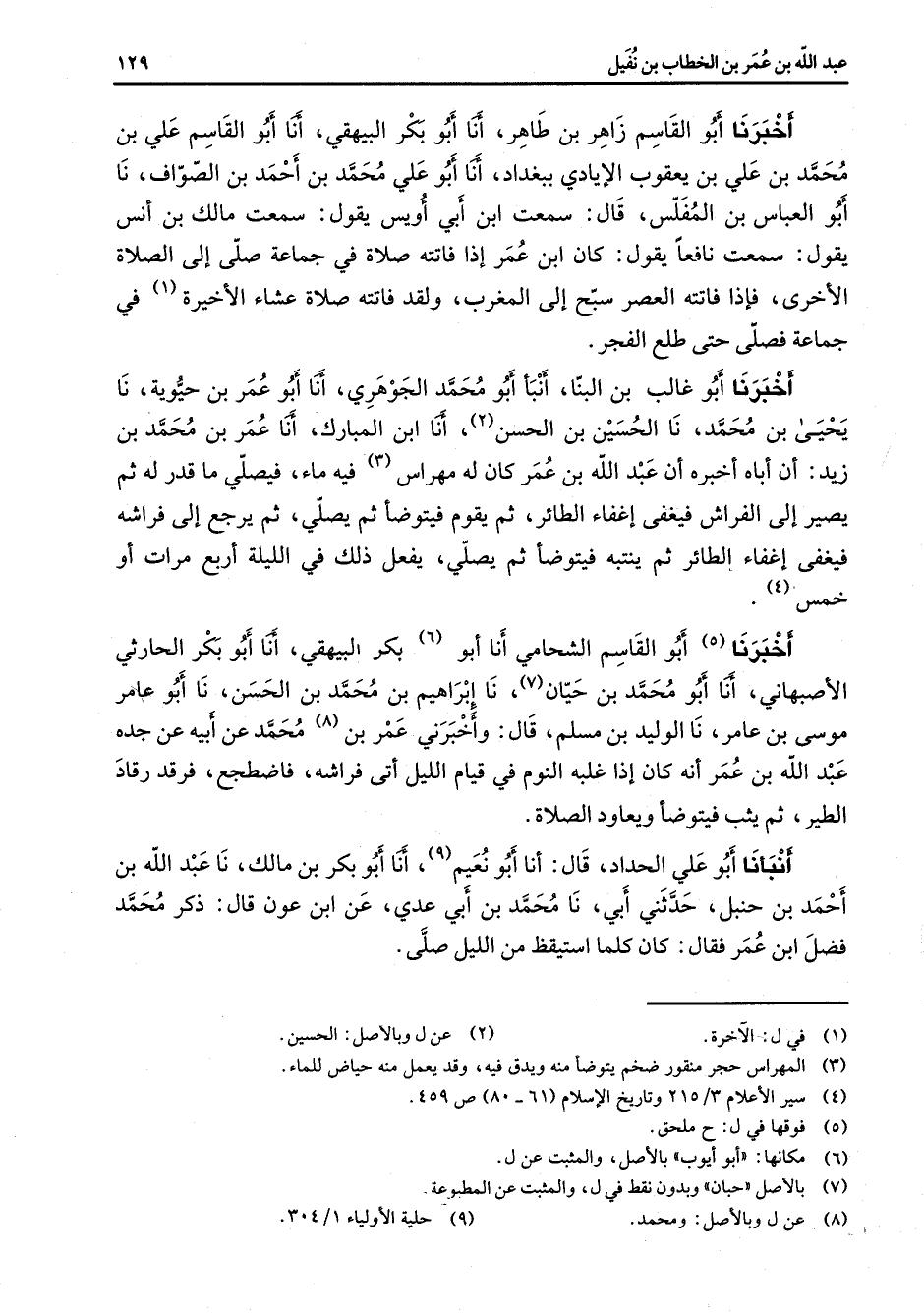 أخبرنا أبو القاسم زاهر بن طاهر أنا أبكر البيهقي أنا أبو القاسم علي بن محمد بن علي بن يعقوب الإيادي ببغداد أنا أبو علي محمد بن أحمد بن الصواف نا أبو العباس بن المفلس قال سمعت ابن أبي أويس يقول سمعت مالك بن أنس يقول سمعت نافعا يقول كان ابن عمر إذا فاتته صلاة في جماعة صلى إلى الصلاة الأخرى فإذا فاتته العصر سبح إلى المغرب ولقد فاتته صلاة عشاء الأخيرة (1) في جماعة فصلى حتى طلع الفجر أخبرنا أبو غالب بن البنا أنبأ أبو محمد الجوهري أنا أبو عمر بن حيوية نا يحيى بن محمد نا الحسين بن الحسن (2) أنا ابن المبارك أنا عمر بن محمد بن زيد أن أباه اخبره أن عبد الله بن عمر كان له مهراس (3) فيه ماء فيصلي ما قدر له ثم يصير إلى الفراش فيغفى إغفاء الطائر ثم يقوم فيتوضأ ثم يصلي فيصلي ثم يرجع إلى فراشه فيغفى إغفاء الطائر ثم ينتبه فيتوضأ ثم يصلي يفعل ذلك في الليلة أربع مرات أو خمس (4) أخبرنا (5) أبو القاسم الشحامي أنا أبو (6) بكر البيهقي أنا أبو بكر الحارثي الأصبهاني أنا أبو محمد بن حيان (7) نا إبراهيم بن محمد بن الحسن نا أبو عامر موسى بن عامر نا الوليد بن مسلم قال وأخبرني عمر بن (8) محمد عن أببه عن جده عبد الله بن عمر أنه كان إذا غلبه النوم في قيام الليل أتى فراشه فاضطجع فرقد رقاد الطير ثم يثب فيتوضأ ويعاود الصلاة أنبأنا أبو علي الحداد قال أنا أبو نعيم (9) أنا أبو بكر بن مالك نا عبد الله بن أحمد بن حنبل حدثني أبي نا محمد بن أبي عدي عن ابن عون قال ذكر محمد فضل ابن عمر فقال كان كلما استيقظ من الليل صلى