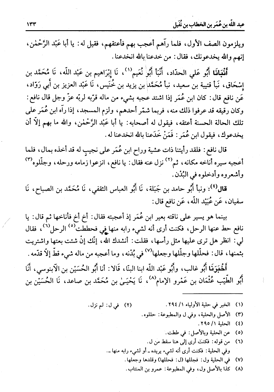ويلزمون الصف الأول فلما رآهم أعجب بهم فأعتقهم فقيل له يا أبا عبد الرحمن إنهم والله يخدعونك فقال من خدعنا بالله انخدعنا أنبأنا أبو علي الحداد أنبأ أبو نعيم (1) نا إبراهيم بن عبد الله نا محمد بن إسحاق نبأ قتيبة بن سعيد نبأ محمد بن يزيد بن خنيس نا عبد العزيز بن أبي رواد عن نافع قال كان ابن عمر إذا اشتد عجبه بشي من ماله قربه لربه عز وجل قال نافع وكان رقيقه قد عرفوا ذلك منه فربما شمر أحدهم ولزم المسجد إذا رآه ابن عمر على تلك الحالة الحسنة أعتقه فيقول له أصحابه يا أبا عبد الرحمن والله ما بهم إلا أن يخدعوك فيقول ابن عمر فمن خدعنا بالله انخدعنا له قال نافع فلقد رأيتنا ذات عشية وراح ابن عمر على نجيب له قد أخذه بمال فلما أعجبه سيره أناخه مكانه ثم (2) نزل عنه فقال يا نافع أنزعوا زمامه ورحله وجللوه (3) وأشعروه وأدخلوه في البدن قال (4) ونبأ أبو حامد بن جبلة نا أبو العباس الثقفي نا محمد نا الصباح نا سفيان عن عبيد الله عن نافع قال بينما هو يسير على ناقته بعير ابن عمر إذ أعجبته فقال أخ أخ فأناخها ثم قال يا نافع حط عنها الرحل فكنت أرى أنه لشئ رابه منها فحططت (5) الرحل (6) فقال لي أنظر هل ترى عليها مثل رأسها فقلت أنشدك الله إنك أن شئت بعتها واشتريت بثمنها قال فحللها وجللها وجعلها (7) في بدنه وما أعجبه من ماله شئ قط إلا قدمه أخبرنا أبو غالب وأبو عبد الله ابنا البنا قالا أنا أبو الحسين بن الآبنوسي أنا أبو الطيب عثمان بن عمرو الإمام (8) نا يحيى بن محمد بن صاعد نا الحسين بن