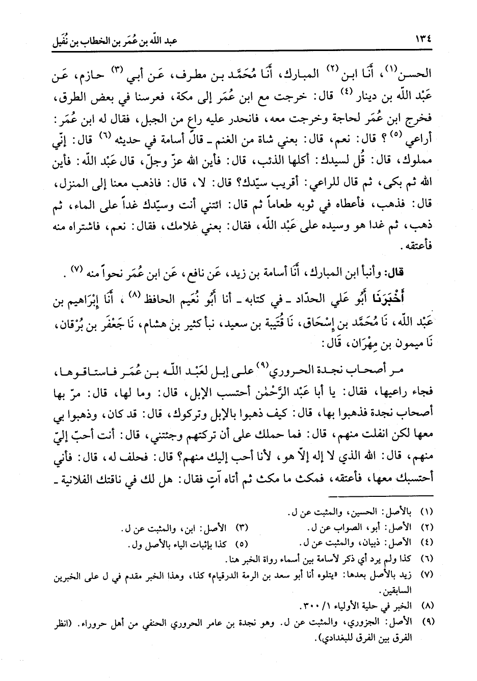 الحسن (1) أنا ابن (2) المبارك أنا محمد بن مطرف عن أبي (3) حازم عن عبد الله بن دينار (4) قال خرجت مع ابن عمر إلى مكة فعرسنا في بعض الطرق فخرج ابن عمر لحاجة وخرجت معه فانحدر عليه راع من الجبل فقال له ابن عمر أراعي (5) قال نعم قال بعني شاة من الغنم قال أسامة في حديثه (6) قال إني مملوك قال قل لسيدك أكلها الذئب قال فأين الله عزجل قال عبد الله فأين الله ثم بكى ثم قال للراعي أقريب سيدك قال لا قال فاذهب معنا إلى المنزل قال فذهب فأعطاه في ثوبه طعاما ثم قال أئتني أنت وسيدك غدا على الماء ثم ذهب ثم غدا هو وسيده على عبد الله فقال بعني غلامك فقال نعم فاشتراه منه فأعتقه قال وأنبأ ابن المبارك أنا أسامة بن زيد عن نافع عن ابن عمر نحوا منه (7) أخبرنا أبو علي الحداد في كتابه أنا أبو نعيم الحافظ (8) أنا إبراهيم بن عبد الله نا محمد بن إسحاق نا قتيبة بن سعيد نبأ كثير بن هشم نا جعفر بن برقان نا ميمون بن مهران قال مر أصحاب نجدة الحروري (9) على إبل لعبد الله بن عمر فاستاقوها فجاء راعيها فقال يا أبا عبد الرحمن أحتسب الإبل قال وما لها قال مر بها أصحاب نجدة فذهبوا بها قال كيف ذهبوا بالإبل وتركوك قال قد كان وذهبوا بي معها لكن أنفلت منهم قال فما حملك على أن تركتهم وجئتني قال أنت أحب إلي منهم قال الله الذي لا إله إلا هو لأنا أحب إليك منهم قال فحلف له قال فأني أحتسبك معها فأعتقه فمكث ما مكث ثم أتاه آت فقال هل لك في ناقتك الفلانية