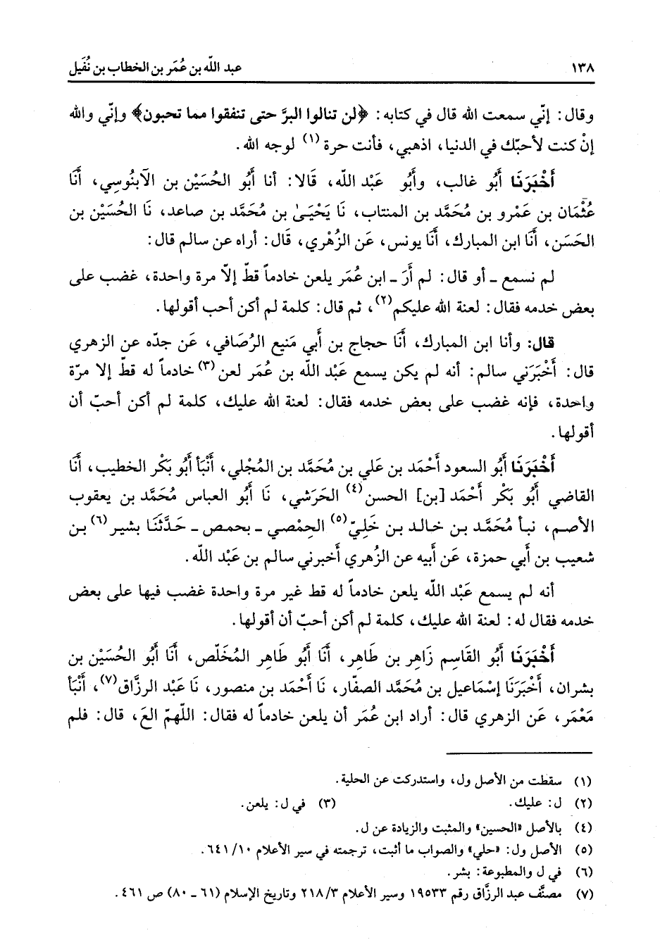 وقال إني سمعت الله قال في كتابه " لن تنالوا البر حتى تنفقوا مما تحبون " وإني والله إن كنت لأحبك في الدنيا اذهبي فأنت حرة (1) لوجه الله أخبرنا أبو غالب وأبو عبد الله قالا أنا أبو الحسين بن الآبنوسي أنا عثمان بن عمرو بن محمد بن المنتاب نا يحيى بن محمد بن صاعد نا الحسين بن الحسن أنا ابن المبارك أنا يونس عن الزهري قال أراه عن سالم قال لم نسمع أو قال لم أر ابن عمر يلعن خادما قط إلا مرة واحدة غضب على بعض خدمه فقال لعنة الله عليكم (2) ثم قال كلمة لم أكن أحب أقولها قال وأنا ابن المبارك أنا حجاج بن أبي منيع الرصافي عن جده عن الزهري قال أخبرني سالم أنه لم يكن يسمع عبد الله بن عمر لعن (3) خادما له قط إلا مرة واحدة فإنه غضب على بعض خدمه فقال لعنة الله عليك كلمة لم أكن أحب أن اقولها أخبرنا أبو السعود أحمد بن علي بن محمد بن المجلي أنبأ أبو بكر الحطيب أنا القاضي أبو بكر أحمد بن الحسن (4) الحرشي نا أبو العباس محمد بن يعقوب الأصم نبأ محمد بن خالد بن خلي (5) الحمصي بحمص حدثنا بشير (6) بن شعيب بن أبي حمزة عن أبيه عن الزهري أخبرني سالم بن عبد الله أنه لم يسمع عبد الله يلعن خادما له قط غير مرة واحدة غضب على فيها بعض خدمه فقال له لعنة الله عليك كلمة لم أكن أحب أن أقولها أخبرنا أبو القاسم زاهر بن طاهر أنا أبو طاهر المخلص أنا أبو الحسين بن بشران أخبرنا إسماعيل بن محمد الصفار نا أحمد بن منصور نا عبد الرزاق (7) أنبأ معمر عن الزهري قال أراد ابن عمر أن يلعن خادما له فقال اللهم الع قال فلم