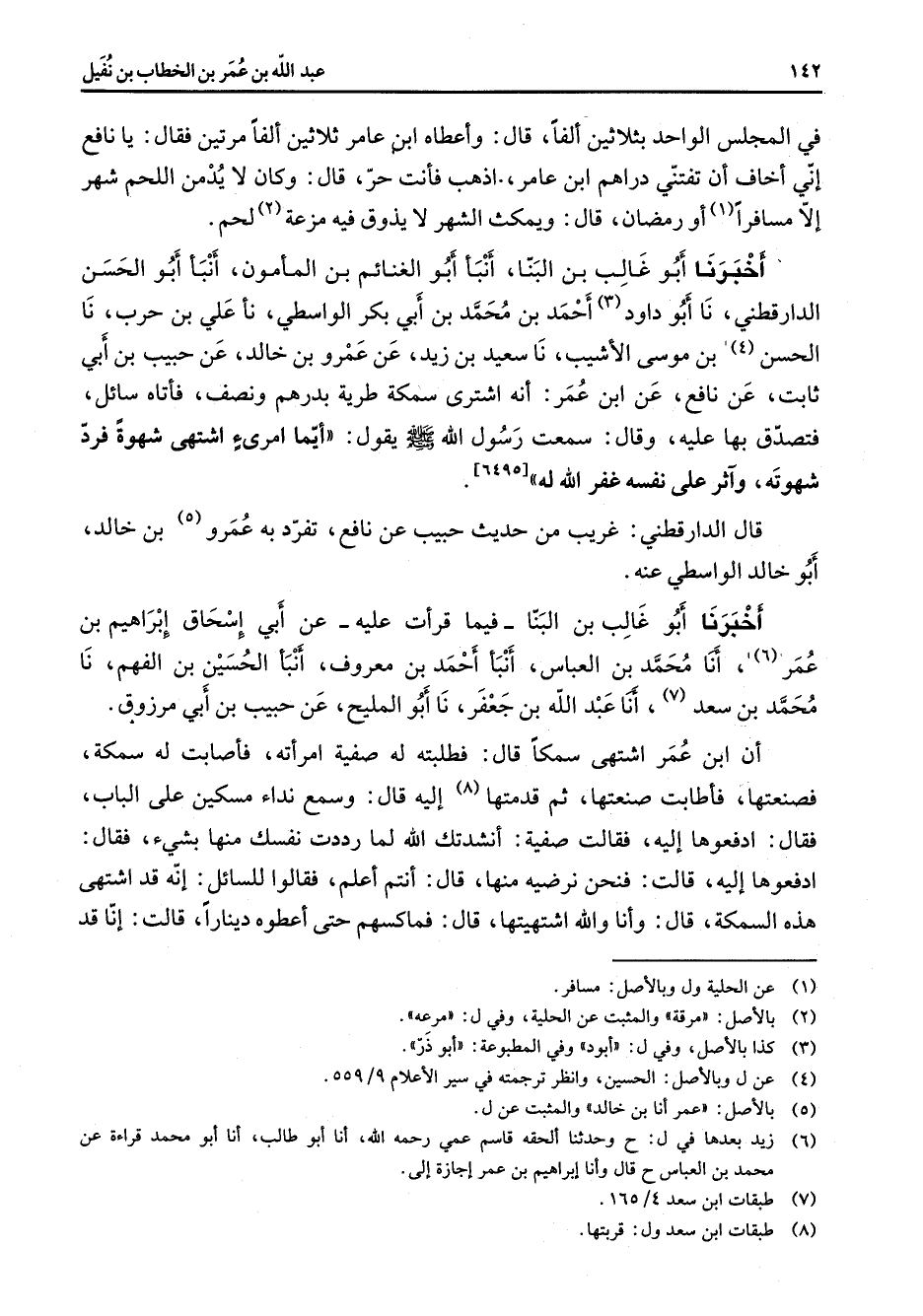 في المجلس الواحد بثلاثين ألفا قال وأعطاه ابن عامر ثلاثين ألفا مرتين فقال يا نافع إني أخاف أن تفتني دراهم ابن عامر اذهب فأنت حر قال وكان لا يدمن اللحم شهر إلا مسافرا (1) أو رمضان قال ويمكث الشهر لا يذوق فيه مزعة (2) لحم أخبرنا أبو غالب بن البنا أنبأ أبو الغنائم بن المأمون أنبأ أبو الحسن الدارقطني نا أبو داود (3) أحمد بن محمد بن أبي بكر الواسطي نا علي بن حرب نا الحسن (4) بن موسى الأشيب نا سعيد بن زيد عن عمرو بن خالد عن حبيب بن أبي ثابت عن نافع عن ابن عمر أنه اشترى سمكة طرية بدرهم ونصف فأتاه سائل فتصدق بها عليه وقال سمعت رسول الله (صلى الله عليه وسلم) يقول أيما امرئ اشتهى شهوة فرد شهوته وآثر على نفسه غفر الله له قال الدارقطني غريب من حديث حبيب عن نافع تفرد به عمرو (5) بن خالد أبو خالد الواسطي عنه أخبرنا أبو غالب بن البنا فيما قرأت عليه عن أبي إسحاق إبراهيم بن عمر (6) أنا محمد بن العباس أنبأ أحمد بن معروف أنبأ الحسين بن الفهم نا محمد بن سعد (7) أنا عبد الله بن جعفر نا أبو المليح عن حبيب بن أبي مرزوق أن ابن عمر اشتهى سمكا قال فطلبته له صفية امرأته فاصابت له سمكة فصنعتها فأطابت صنعتها ثم قدمتها (8) إليه قال وسمع نداء مسكين على الباب فقال ادفعوها إليه فقالت صفية أنشدتك الله لما رددت نفسك منها بشئ فقال ادفعوها إليه قالت فنحن نرضيه منها قال أنتم أعلم فقالوا للسائل إنه قد اشتهى هذه السمكة قال وأنا والله اشتهيتها قال فماكسهم حتى أعطوه دينارا قالت إنا قد
