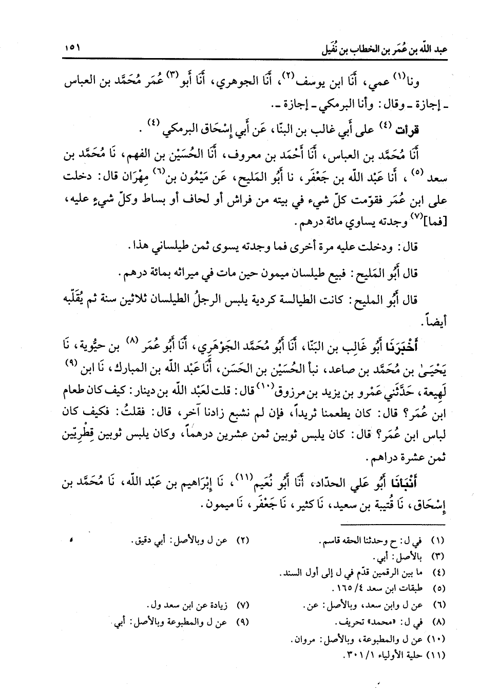 ونا (1) عمي أنا ابن يوسف (2) أنا الجوهري أنا أبو (3) عمر محمد بن العباس إجازة وقال وأنا البرمكي إجازة قرأت (4) على أبي غالب بن البنا عن أبي إسحاق البرمكي (4) أنا محمد بن العباس أنا أحمد بن معروف أنا الحسين بن الفهم نا محمد بن سعد (5) أنا عبد الله بن جعفر نا أبو المليح عن ميمون بن (6) مهران قال دخلت على ابن عمر فقومت كل شئ في بيته من فراش أو لحاف أو بساط وكل شئ عليه فما وجدته يساوي مائة درهم قال ودخلت عليه مرة أخرى فما (7) وجدته يسوى ثمن طيلساني هذا قال أبو المليح فبيع طيلسان ميمون حين مات في ميراثه بمائة درهم قال أبو المليح كانت الطيالسة كردية يلبس الرجل الطيلسان ثلاثين سنة ثم يقلبه أيضا أخبرنا أبو غالب بن البنا أنا أبو محمد الجوهري أنا أبو عمر (8) بن حيوية نا يحيى بن محمد بن صاعد نبأ الحسين بن الحسن أنا عبد الله بن المبارك نا ابن (9) لهيعة حدثني عمرو بن يزيد بن مرزوق (10) قال قلت لعبد الله بن دينار كيف كان طعام ابن عمر قال كان يطعمنا ثريدا فإن لم نشبع زادنا آخر فقلت فكيف كان لباس ابن عمر قال كان يلبس ثوبين ثمن عشرين درهما وكان يلبس ثوبين قطريين ثمن عشرة دراهم أنبأنا أبو علي الحداد أنا أبو نعيم (11) نا إبراهيم بن عبد الله نا محمد بن إسحاق نا قتيبة بن سعيد نا كثير نا جعفر نا ميمون