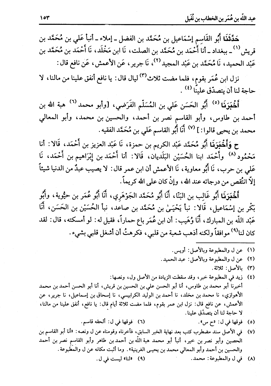 حدثنا أبو القاسم إسماعيل بن محمد بن الفضل إملاء أنبأ علي بن محمد بن قريش (1) ببغداد أنا أحمد بن محمد بن الصلت نا ابن مخلد نا أحمد بن محمد بن عبد الحميد نا محمد بن عبد المجيد (2) نا جرير عن الأعمش عن نافع قال نزل ابن عمر بقوم فلما مضت ثلاث (3) ليال قال يا نافع انفق علينا من مالنا لا حاجة لنا ان يتصدق علينا (4) أخبرنا (5) أبو الحسن علي بن المسلم الفرضي وأبو محمد (6) هبة الله بن أحمد بن طاوس وأبو القاسم نصر بن أحمد والحسين بن محمد وأبو المعالي محمد بن يحيى قالوا (7) أنا أبو القاسم علي بن محمد الفقيه ح وأخبرنا محمد عبد الكريم بن حمزة نا عبد العزيز بن أحمد قالا أنا محمود (8) وأحمد ابنا الحسين البلديان قالا أنا أحمد بن إبراهيم بن أحمد نا علي بن حرب نا أبو معاوية نا الأعمش أن ابن عمر قال لا يصيب عبد من الدنيا شيئا إلا انتقص من درجاته عند الله وإن كان على الله كريما أخبرنا أبو غالب بن البنا أنا أبو محمد الجوهري أنا أبو عمر بن حيوية وأبو بكر بن إسماعيل قالا نبأ يحيى بن محمد بن صاعد نبأ الحسين بن الحسن أنا عبد الله بن المبارك أنا وهيب أن ابن عمر باع حمارا فقيل له لو أمسكته قال لقد كان لنا (9) موافقا ولكنه أذهب شعبة من قلبي فكرهت أن أشغل قلبي بشئ