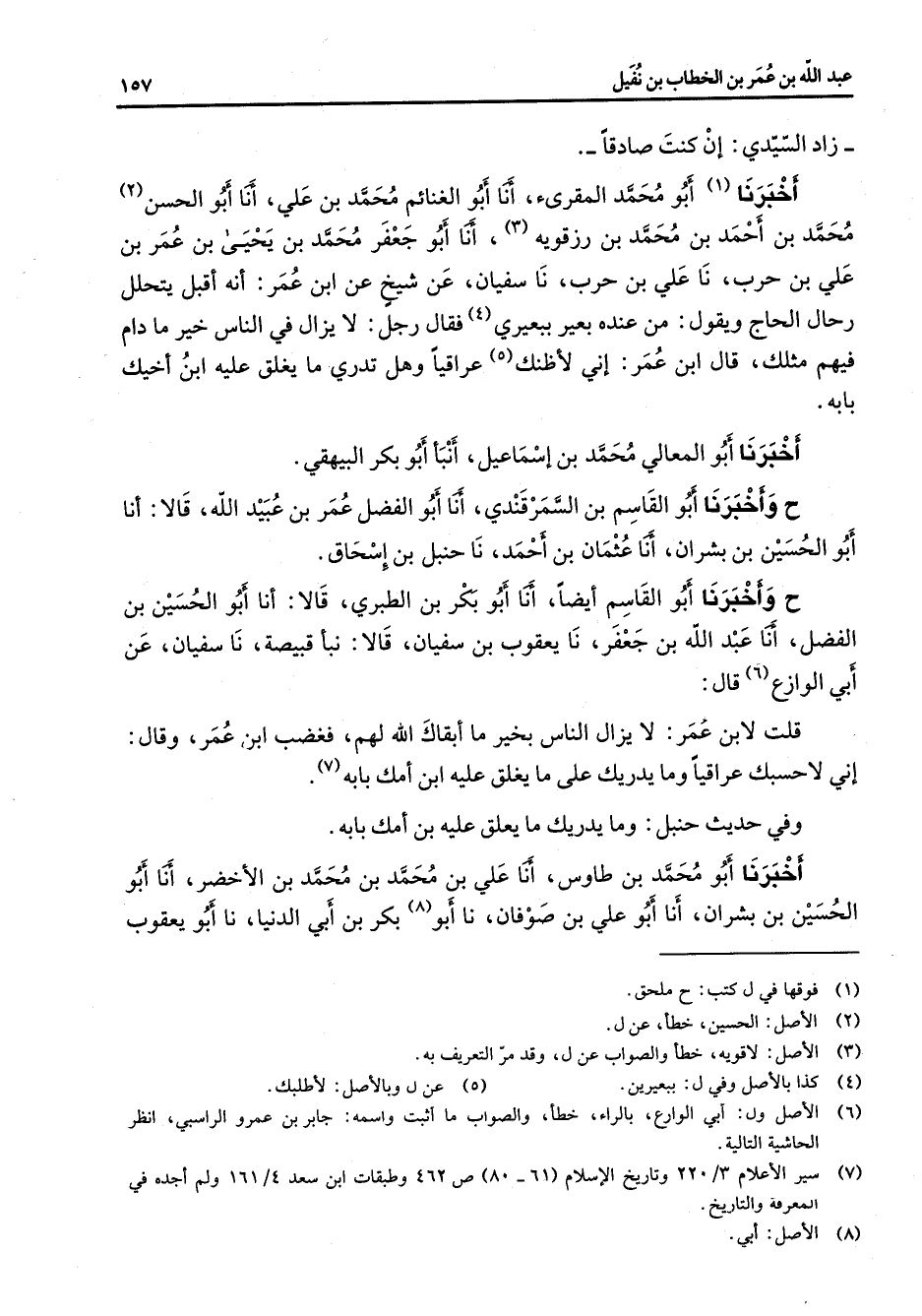 زاد السيدي إن كنت صادقا أخبرنا (1) أبو محمد المقرئ أنا أبو الغنائم محمد بن علي أنا أبو الحسن (2) محمد بن أحمد بن محمد بن زرقويه (3) أنا أبو جعفر محمد بن يحيى بن عمر بن علي بن حرب نا علي بن حرب نا سفيان عن شيخ عن ابن عمر أنه أقبل يتحلل رحال الحاج ويقول من عنده بعير ببعيري (4) فقال رجل لا يزال في الناس خير ما دام فيهم مثلك قال ابن عمر إني أظنك (5) عراقيا وهل تدري ما يغلق عليه ابن أخيك بابه أخبرنا أبو المعالي محمد بن إسماعيل أنبأ أبو بكر البيهقي ح وأخبرنا أبو القاسم بن السمرقندي أنا أبو الفضل عمر بن عبيد الله قالا أنا أبو الحسين بن بشران أنا عثمان بن أحمد نا حنبل بن إسحاق ح وأخبرنا أبو القاسم أيضا أنا أبو بكر بن الطبري قالا أنا أبو الحسين بن الفضل أنا عبد الله بن جعفر نا يعقوب بن سفيان قالا نبأ قبيصة نا سفيان عن أبي الوازع (6) قال قلت لابن عمر لا يزال الناس بخير ما أبقاك الله لهم فغضب ابن عمر وقال إني لأحسبك عراقيا وما يدريك على ما يغلق عليه ابن أمك بابه (7) وفي حديث حنبل وما يدريك ما يعلق عليه بن أمك بابه أخبرنا أبو محمد بن طاوس أنا علي بن محمد بن محمد بن الأخضر أنا أبو الحسين بن بشران أنا أبو علي بن صوفان نا أبو (8) بكر بن أبي الدنيا نا أبو يعقوب
