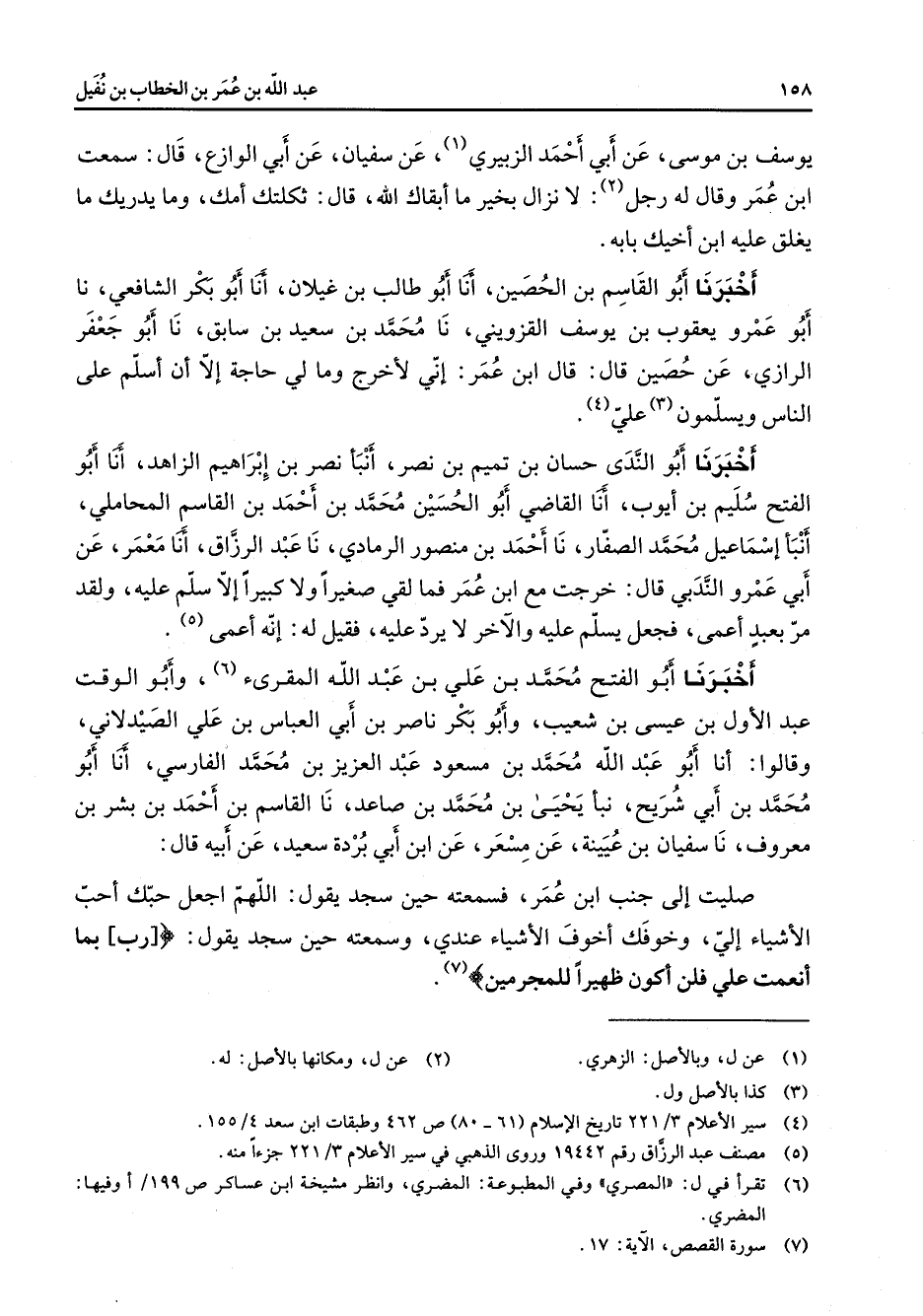يوسف بن موسى عن أبي أحمد الزبيري (1) عن سفيان عن أبي الوازع قال سمعت ابن عمر وقال له رجل (2) لا نزال بخير ما أبقاك الله قال ثكلتك أمك وما يدريك ما يغلق عليه ابن أخيك بابه أخبرنا أبو القاسم بن الحصين أنا أبو طالب بن غيلان أنا أبو بكر الشافعي نا أبو عمرو يعقوب بن يوسف القزويني نا محمد بن سعيد بن سابق نا أبو جعفر الرازي عن حصين قال قال ابن عمر إني لأخرج ومالي حاجة إلا أن أسلم على الناس ويسلمون (3) علي (4) أخبرنا أبو الندى حسان بن تميم بن نصر أنبأ نصر بن إبراهيم الزاهد أنا أبو الفتح سليم بن أيوب أنا القاضي أبو الحسين محمد بن أحمد بن القاسم المحاملي أنبأ إسماعيل محمد الصفار نا أحمد بن منصور الرمادي نا عبد الرزاق أنا معمر عن أبي عمرو الندبي قال خرجت مع ابن عمر فما لقي صغيرا ولا كبيرا إلا سلم عليه ولقد مر بعبد أعمى فجعل يسلم عليه والآخر لا يرد عليه فقيل له إنه أعمى (5) أخبرنا أبو الفتح محمد بن علي بن عبد الله المقرئ (6) وأبو الوقت عبد الأول بن عيسى بن شعيب وأبو بكر ناصر بن أبي العباس بن علي الصيدلاني وقالوا أنا أبو عبد الله محمد بن مسعود عبد العزيز بن محمد الفارسي أنا أبو محمد بن أبي شريح نبأ يحيى بن محمد بن صاعد نا القاسم بن أحمد بن بشر بن معروف نا سفيان بن عيينة عن مسعر عن ابن أبي بردة سعيد عن أبيه قال صليت إلى جنب ابن عمر فسمعته حين سجد يقول اللهم أجعل حبك أحب الأشياء إلي وخوفك أخوف الأشياء عندي وسمعته حين سجد يقول " رب بما أنعمت علي فلن أكون ظهيرا للمجرمين " (7)
