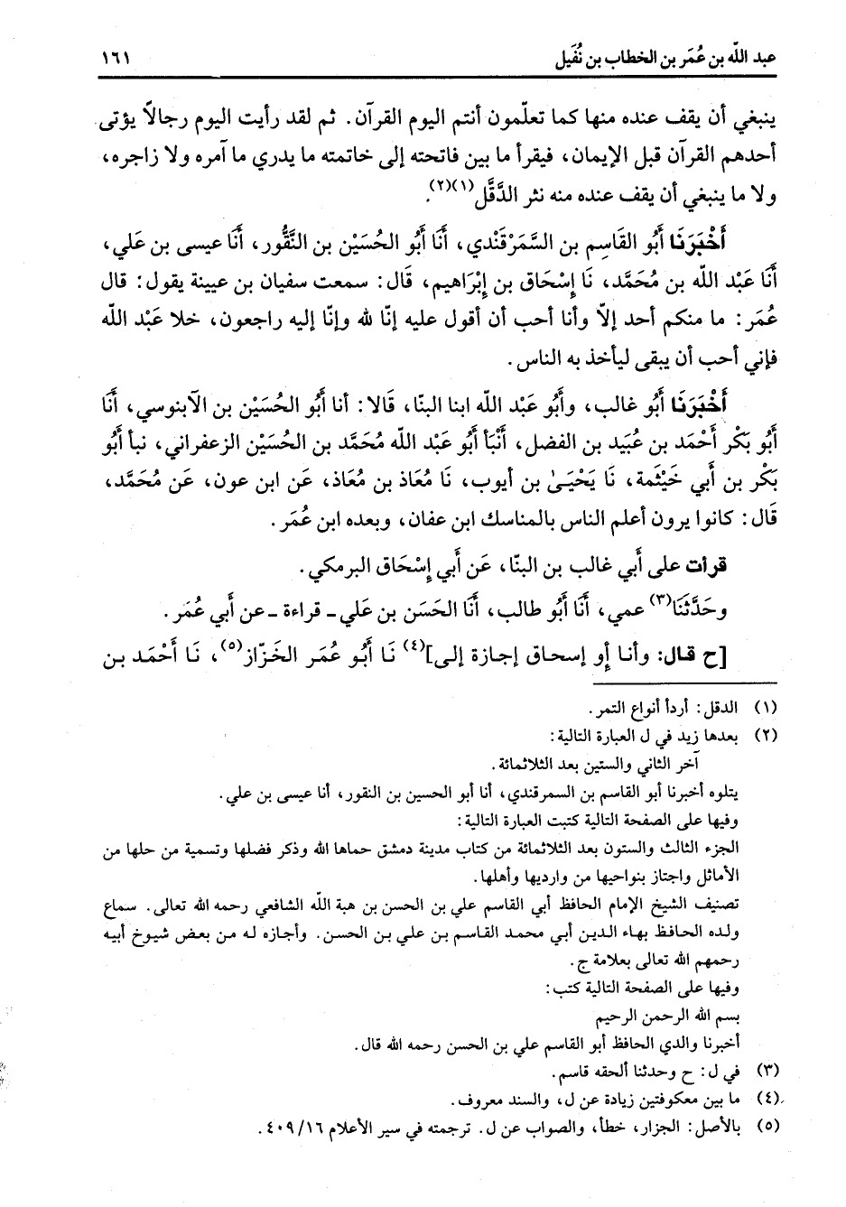 ينبغي أن يقف عنده منها كما تعلمون أنتم اليوم القرآن ثم لقد رأيت اليوم رجالا يؤتى أحدهم القرآن قبل الإيمان فيقرأ ما بين فاتحته إلى خاتمته ما يدري ما آمره ولا زاجره ولا ما ينبغي أن يقف عنده منه نثر الدقل (1) (2) أخبرنا أبو القاسم بن السمرقندي أنا أبو الحسين بن النقور أنا عيسى بن علي أنا عبد الله بن محمد نا إسحاق بن إبراهيم قال سمعت سفيان بن عيينة يقول قال عمر ما منكم أحد إلا وأنا أحب أن أقول عليه إنا لله وإنا إليه راجعون خلا عبد الله فإني أحب أن يبقى ليأخذ به الناس أخبرنا أبو غالب وأبو عبد الله ابنا البنا قالا أنا أبو الحسين بن الآبنوسي أنا أبو بكر أحمد بن عبيد بن الفضل أنبأ أبو عبد الله محمد بن الحسين الزعفراني نبأ أبو بكر بن أبي خيثمة نا يحيى بن أيوب نا معاذ بن معاذ عن ابن عون عن محمد قال كانوا يرون أعلم الناس بالمناسك ابن عفان وبعده ابن عمر قرأت على أبي غالب بن البنا عن أبي إسحاق البرمكي وحدثنا (3) عمي أنا أبو طالب أنا الحسن بن علي قراءة عن أبي عمر ح قال وأنا أو إسحاق إجازة إلى (4) نا أبو عمر الخزاز (5) نا أحمد بن