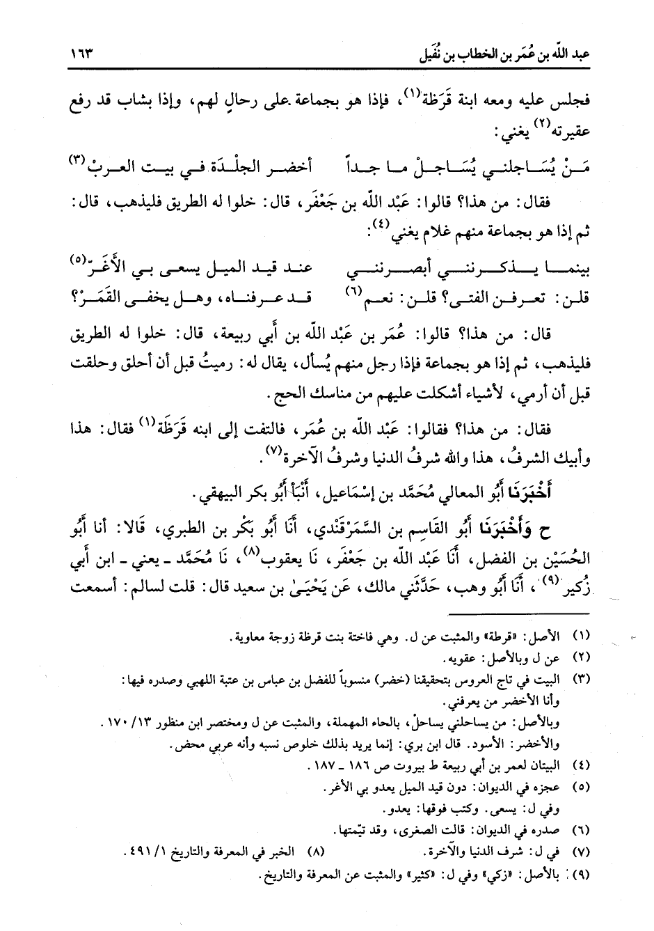 فجلس عليه ومعه ابنة قرظة (1) فإذا هو بجماعة على رحال لهم وإذا بشاب قد رفع عقيرته (2) يغني * من يساجلني يساجل ماجدا * أخضر الجلدة في بيت العرب (3) * فقال من هذا قالوا عبد الله بن جعفر قال خلوا له الطريق فليذهب قال ثم إذا هو بجماعة منهم غلام يغني (4) * بينما يذكرنني أبصرنني * عند قيد الميل يسعى بي الأغر (5) قلن تعرفن الفتى قلن نعم (6) * قد عرفناه وهل يخفى القمر * قال من هذا قالوا عمر بن عبد الله بن أبي ربيعة قال خلوا له الطريق فليذهب ثم إذا هو بجماعة فإذا رجل منهم يسأل يقال له رميت قبل أن أحلق وحلقت قبل أن أرمي لأشياء أشكلت عليهم من مناسك الحج فقال من هذا فقالوا عبد الله بن عمر فالتفت إلى ابنة قرظة (1) فقال هذا وأبيك الشرف هذا والله شرف الدنيا وشرف الآخرة (7) أخبرنا أبو المعالي محمد بن إسماعيل أنبأ أبو بكر البيهقي ح وأخبرنا أبو القاسم بن السمرقندي أنا أبو بكر بن الطبري قالا أنا أبو الحسين بن الفضل أنا عبد الله بن جعفر نا يعقوب (8) نا محمد يعني ابن أبي زكير (9) نا أبو وهب حدثني مالك عن يحيى بن سعيد قال قلت لسالم اسمعت