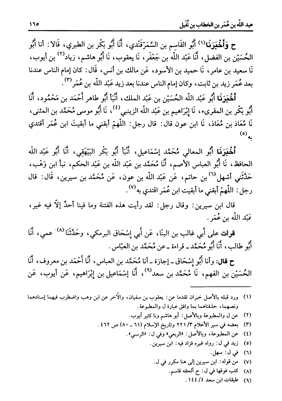 ح وأخبرنا (1) أبو القاسم بن السمرقندي أنا أبو بكر بن الطبري قالا أنا أبو الحسين بن الفضل أنا عبد الله بن جعفر نا يعقوب نا أبو هاشم زياد (2) بن أيوب نا سعيد بن عامر نا حميد بن الأسود عن مالك بن أنس قال كان إمام الناس عندنا بعد عمر زيد بن ثابت وكان إمام الناس عندنا بعد زيد عبد الله بن عمر (3) أخبرنا أبو عبد الله الحسين بن عبد الملك أنبأ أبو طاهر أحمد بن محمود أنا أبو بكر بن المقرئ نا إبراهيم بن عبد الله الزينبي (4) نا أبو موسى محمد بن المثنى نا معاذ بن معاذ نا ابن عون قال قال رجل اللهم ابقي ما أبقني ابن عمر أقتدي به (5 (أخبرنا أبو المعالي محمد إسماعيل أنبأ أبو بكر البيهقي أنا أبو عبد الله الحافظ نا أبو العباس الأصم أنا محمد بن عبد الله بن عبد الحكم نبأ ابن وهب حدثني أشهل (6) بن حاتم عن عبد الله بن عون عن محمد بن سيرين قال قال رجل اللهم أبقني ما أبقيت ابن عمر أقتدي به (7) قال ابن سيرين وقال رجل لقد رأيت هذه الفتنة وما فينا أحد إلا فيه غير عبد الله بن عمر قرأت على أبي غالب بن البنا عن ابي إسحاق البرمكي وحدثنا (8) عمي أنا أبو طالب أنا أبو محمد قراءة عن محمد بن العباس ح قال وأنا أبو إسحاق إجازة أنا محمد بن العباس أنا أحمد بن معروف أنا الحسين بن الفهم نا محمد بن سعد (9) أنا إسماعيل بن إبراهيم عن أيوب عن