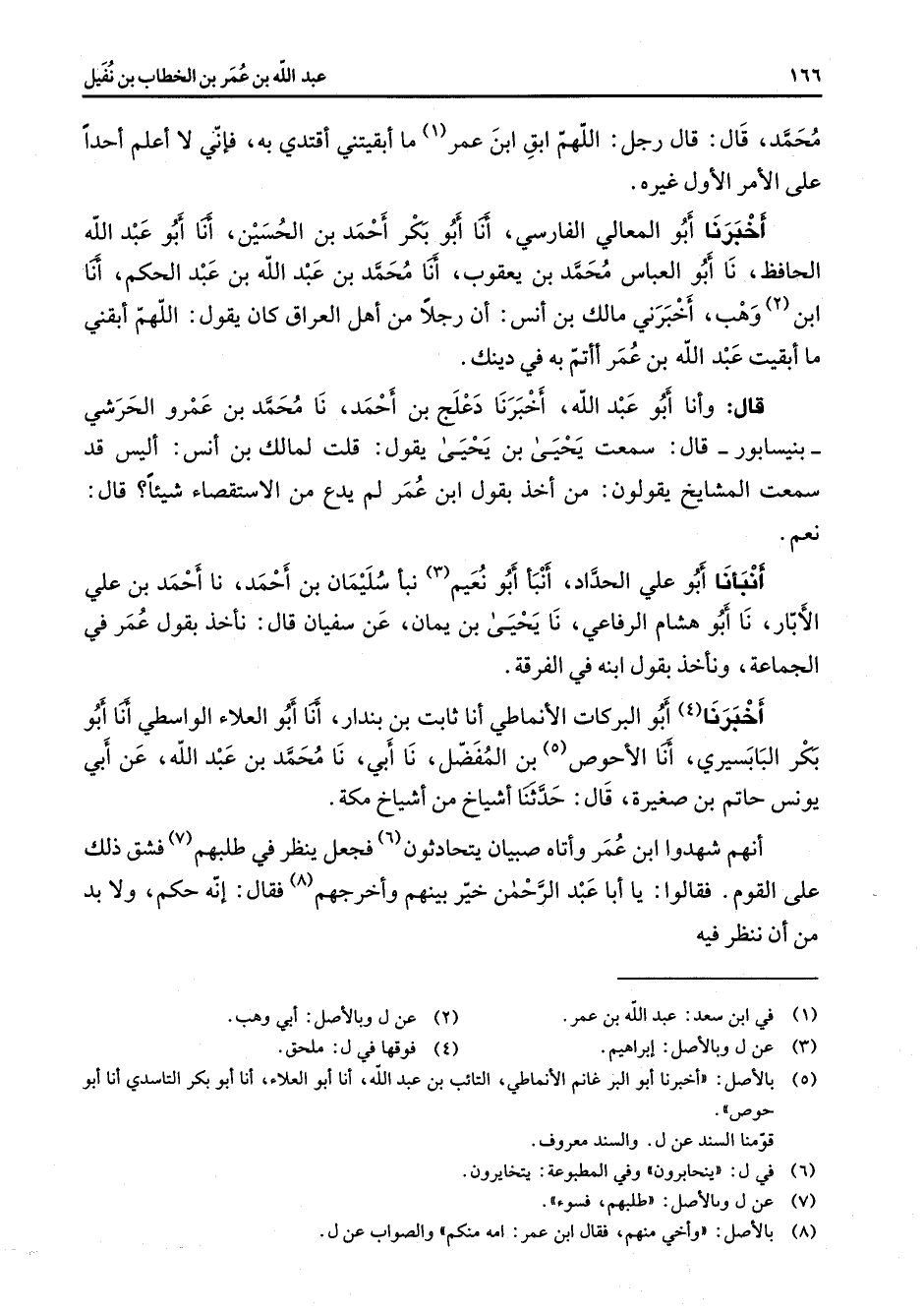 محمد قال قال رجل اللهم ابق ابن عمر (1) ما أبقيتني أقتدي به فإني لا أعلم أحدا على الأمر الأول غيره أخبرنا أبو المعالي الفارسي أنا أبو بكر أحمد بن الحسين أنا أبو عبد الله الحافظ نا أبو العباس محمد بن يعقوب أنا محمد بن عبد الله بن عبد الحكم أنا ابن وهب (2) أخبرني مالك بن أنس أن رجلا من أهل العراق كان يقول اللهم أبقني ما أبقيت عبد الله بن عمر أأتم به في دينك قال وأنا أبو عبد الله أخبرنا دعلج بن أحمد نا محمد بن عمرو الحرشي بنيسابور قال سمعت يحيى بن يحيى يقول قلت لمالك بن أنس أليس قد سمعت المشايخ يقولون من أخذ بقول ابن عمر لم يدع من الإستقصاء شيئا قال نعم أنبأنا أبو علي الحداد أنبأ أبو نعيم (3) نبأ سليمان بن أحمد نا أحمد بن علي الأبار نا أبو هشام الرفاعي نا يحيى بن يمان عن سفيان قال نأخذ بقول عمر في الجماعة ونأخذ بقول ابنه في الفرقة أخبرنا (4) أبو البركات الأنماطي أنا ثابت بن بندار أنا أبو العلاء الواسطي أنا أبو بكر البابسيري أنا الأحوص (5) بن المفضل نا أبي نا محمد بن عبد الله عن أبي يونس حاتم بن صغيرة قال حدثنا أشياخ من أشياخ مكة أنهم شهدوا ابن عمر وأتاه صبيان يتحادثون (6) فجعل ينظر في طلبهم (7) فشق ذلك على القوم فقالوا يا أبا عبد الرحمن خير بينهم وأخرجهم (8) فقال إنه حكم ولا بد من أن ننظر فيه