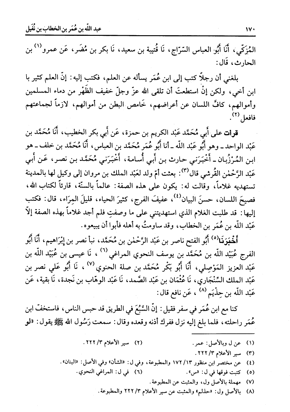 المزكي أنا أبو العباس السراج نا قتيبة بن سعيد نا بكر بن مضر عن عمرو (1) بن الحارث قال بلغني أن رجلا كتب إلى ابن عمر يساله عن العلم فكتب إليه إن العلم كثير يا ابن أخي ولكن إن استطعت أن تلقى الله عز وجل خفيف الظهر من دماء المسلمين وأموالهم كاف اللسان عن أعراضهم خامص البطن من أموالهم لازما لجماعتهم فافعل (2) قرأت على ابي محمد عبد الكريم بن حمزة عن أبي بكر الخطيب أنا محمد بن عبد الواحد وهو أبو عبد الله انا أبو عمر محمد بن العباس أنا محمد بن خلف هو ابن المرزبان أخبرني حارث بن أبي أسامة أخبرني محمد بن نصر عن أبي عبد الرحمن القرشي (3) قال بعثت أم ولد لعبد الملك بن مروان إلى وكيل لها بالمدينة تستهديه غلاما وقالت له يكون على هذه الصفة عالما بالسنة قارئا لكتاب الله فصيح اللسان حسن البيان (4) عفيف الفرج كثير الحياء قليل المراء قال فكتب إليها قد طلبت الغلام الذي استهديتني على ما وصفت فلم أجد غلاما بهذه الصفة إلا عبد الله بن عمر بن الخطاب وقد ساومت به أهله فأبوا أن يبيعوه أخبرنا (5) أبو الفتح ناصر بن عبد الرحمن بن محمد نبأ نصر بن إبراهيم أنا أبو الفرج عبيد الله بن محمد بن يوسف النحوي المراغي (6) نا عيسى بن عبيد الله بن عبد العزيز الموصلي أنا أبو بكر محمد بن صلة الحنوي (7) نا أبو علي نصر بن عبد الملك السنجاري نا عثمان بن عبد الصمد نا عبد الوهاب بن نجدة نا بقية عن عبد الله بن حذيم (8) عن نافع قال كنا مع ابن عمر في سفر فقيل إن السبع في الطريق قد حبس الناس فاستخف ابن عمر راحلته فلما بلغ إليه نزل ففرك أذنه وقعده وقال سمعت رسول الله (صلى الله عليه وسلم) يقول لو