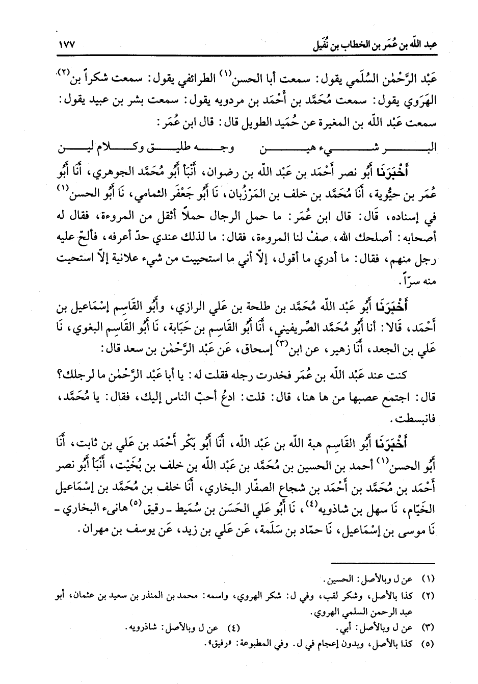عبد الرحمن السلمي يقول سمعت أبا الحسن (1) الطرائفي يقول سمعت شكرا بن (2) الهروي يقول سمعت محمدا بن أحمد بن مردوية يقول سمعت بشر بن عبيد يقول سمعت عبد الله بن المغيرة عن حميد الطويل قال قال ابن عمر * البر شي هين * وجه طلق وكلام لين * أخبرنا أبو نصر أحمد بن عبد الله بن رضوان أنبأ أبو محمد الجوهري أنا أبو عمر بن حيوية أنات محمد بن خلف بن المرزبان نا أبو جعفر الثمامي نا أبو الحسن (1) في إسناده قال قال ابن عمر ما حمل الرجال حملا أثقل من المروءة فقال له أصحابه أصلحك الله صف لنا المروءة فقال ما لذلك عندي حد أعرفه فألح عليه رجل منهم فقال ما أدري ما اقول إلا أني ما استحييت من شئ علانية إلا استحيت منه سرا أخبرنا أبو عبد الله محمد بن طلحة بن علي الرازي وأبو القاسم إسماعيل بن أحمد قالا أنا أبو محمد الصريفيني أنا أبو القاسم بن حبابة نا أبو القاسم البغوي نا علي بن الجعد انا زهير عن ابن (3) إسحاق عن عبد الرحمن بن سعد قال كنت عند عبد الله بن عمر فخدرت رجله فقلت له يا أبا عبد الرحمن ما لرجلك قال اجتمع عصبها من ها هنا قال قلت ادع أحب الناس إليك فقال يا محمد فانبسطت أخبرنا أبو القاسم هبة الله بن عبد الله أنا أبو بكر أحمد بن علي بن ثابت أنا أبو الحسن أحمد بن الحسين بن محمد بن عبد الله بن خلف بن بخيت أنبأ أبو نصر أحمد بن محمد بن أحمد بن شجاع الصفار البخاري أنا خلف بن محمد بن إسماعيل الخيام نا سهل بن شاذوية (4) نا أبو علي الحسن بن سميط رقيق (5) هانئ البخاري نا موسى بن إسماعيل نا حماد بن سلمة عن علي بن زيد عن يوسف بن مهران
