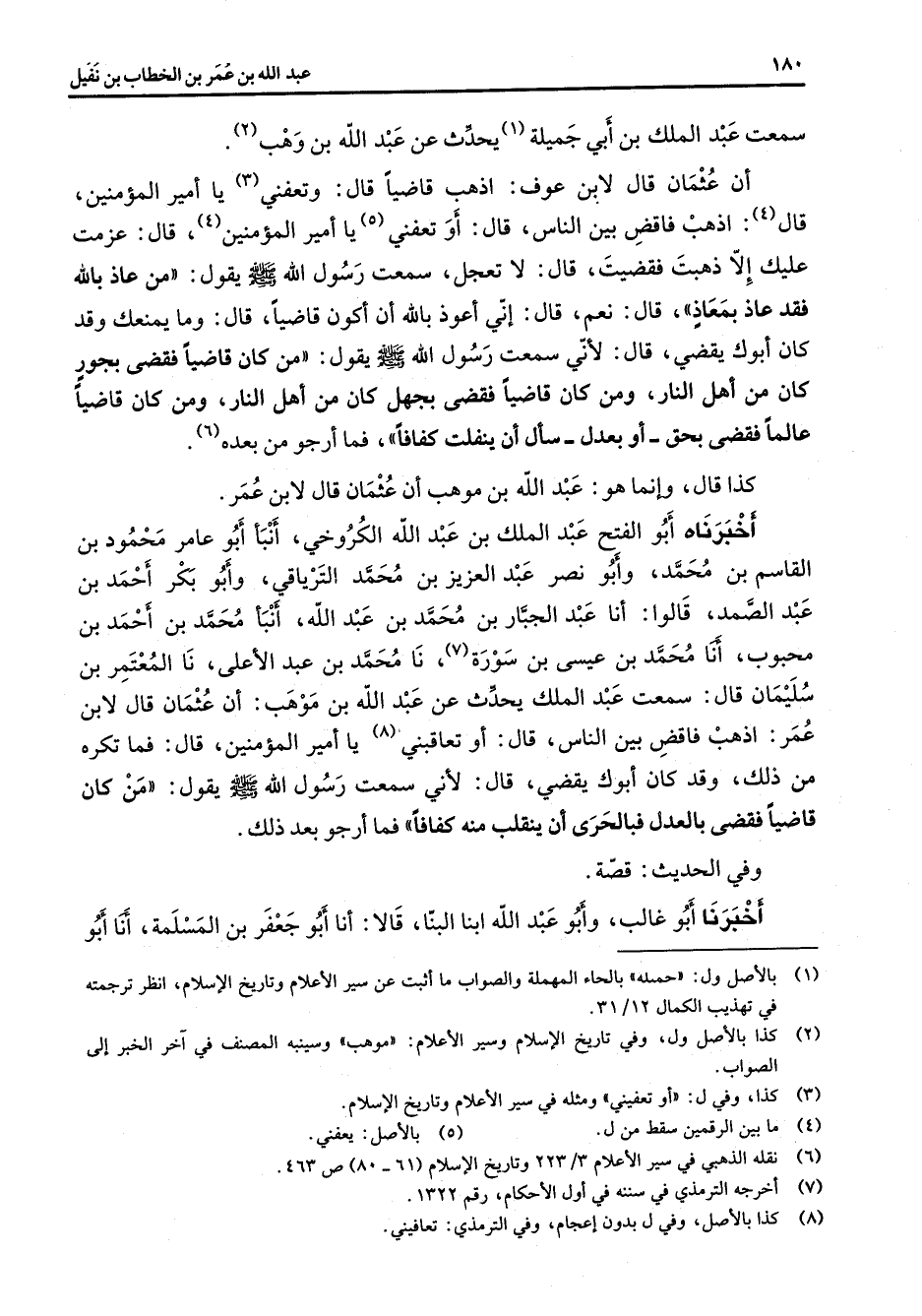 سمعت عبد الملك بن ابي جميلة (1) يحدث عن عبد الله بن وهب (2) أن عثمان قال لابن عوف اذهب قاضيا قال وتعفني (3) يا أمير المؤمنين قال (4) اذهب فاقض بين الناس قال أو تعفني (5) يا أمير المؤمنين (4) قال عزمت عليك إلا ذهبت فقضيت قال لا تعجل سمعت رسول الله (صلى الله عليه وسلم) يقول من عاذ بالله فقد عاذ بمعاذ قال نعم قال إني أعوذ بالله أن أكون قاضيا قال وما يمنعك وقد كان أبوك يقضي قال لأني سمعت رسول الله (صلى الله عليه وسلم) يقول من كان قاضيا فقضى بجور كان من أهل النار ومن كان قاضيا فقضى بجهل كان من أهل النار ومن كان قاضيا عالما فقضى بحق أو بعدل سأل أن ينفلت كفافا فما أرجو من بعده (6) كذا قال وإنما هو عبد الله بن موهب أن عثمان قال لابن عمر أخبرناه أبو الفتح عبد الملك بن عبد الله الكروخي أنبأ أبو عامر محمود بن القاسم بن محمد وأبو نصر عبد العزيز بن محمد الترياقي وأبو بكر أحمد بن عبد الصمد قالوا أنا عبد الجبار بن محمد بن عبد الله أنبأ محمد بن أحمد بن محبوب أنا محمد بن عيسى بن سورة (7) نا محمد بن عبد الأعلى نا المعتمر بن سليمان قال سمعت عبد الملك يحدث عن عبد الله بن موهب أن عثمان قال لابن عمر اذهب فاقض بين الناس قال أو تعاقبني (8) يا أمير المؤمنين قال فما تكره من ذلك وقد كان أبوك يقضي قال لأني سمعت رسول الله (صلى الله عليه وسلم) يقول من كان قاضيا فقضى بالعدل فالبحري أن ينقلب منه كفافا فما أرجو بعد ذلك وفي الحديث قصة أخبرنا أبو غالب وأبو عبد الله ابنا البنا قالا أنا أبو جعفر بن المسلمة أنا أبو