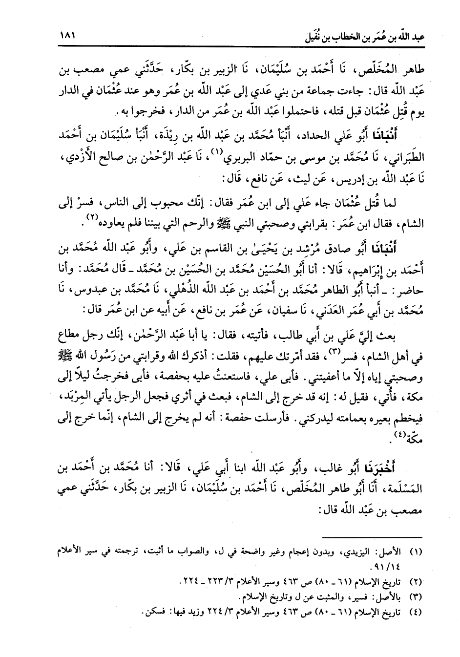 طاهر المخلص نا أحمد بن سليمان نا الزبير بن بكار حدثني عمي مصعب بن عبد الله قال جاءت جماعة من بني عدي إلى عبد الله بن عمر وهو عند عثمان في الدار يوم قتل عثمان قبل قتله فاحتملوا عبد الله بن عمر من الدار فخرجوا به أنبأنا أبو علي الحداد أنبأ محمد بن عبد الله بن ريذة أنبأ سليمان بن أحمد الطبراني نا محمد بن موسى بن حماد البربري (1) نا عبد الرحمن بن صالح الأزدي نا عبد الله بن إدريس عن ليث عن نافع قال لما قتل عثمان جاء علي إلى ابن عمر فقال إنك محبوب إلى الناس فسر إلى الشام فقال ابن عمر بقرابتي وصحبتي النبي (صلى الله عليه وسلم) والرحم التي بيننا فلم يعاوده (2) أنبأنا أبو صادق مرشد بن يحيى بن القاسم بن علي وأبو عبد الله محمد بن أحمد بن إبراهيم قالا أنا أبو الحسين محمد بن الحسين بن محمد قال محمد وأنا حاضر أنبأ أبو الطاهر محمد بن أحمد بن عبد الله الذهلي نا محمد بن عبدوس نا محمد بن أبي عمر العدني نا سفيان عن عمر بن نافع عن أبيه عن ابن عمر قال بعث لي علي بن أبي طالب فأتيته فقال يا أبا عبد الرحمن إنك رجل مطاع في أهل الشام فسر (3) فقد أمرتك عليهم فقلت أذكرك الله وقرابتي من رسول الله (صلى الله عليه وسلم) وصحبتي إياه إلا ما أعفيتني فأبى علي فاستعنت عليه بحفصة فأبى فخرجت ليلا إلى مكة فأتي فقيل له إنه قد خرج إلى الشام فبعث في أثري فجعل الرجل يأتي المربد فيخطم بعيره بعمامته ليدركني فأرسلت حفصة أنه لم يخرج إلى الشام إنما خرج إلى مكة (4) أخبرنا أبو غالب وأبو عبد الله ابنا أبي علي قالا أنا محمد بن أحمد بن المسلمة أنا أبو طاهر المخلص نا أحمد بن سليمان نا الزبير بن بكار حدثني عمي مصعب بن عبد الله قال