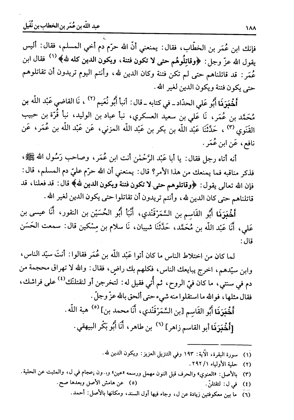 فإنك ابن عمر بن الخطاب فقال يمنعني أن الله حرم دم أخي المسلم فقال أليس يقول الله عز وجل " وقاتلوهم حتى لا تكون فتنة ويكون الدين كله لله " (1) فقال ابن عمر قد قاتلناهم حتى لم تكن فتنة وكان الدين لله وأنتم اليوم تريدون أن تقاتلوهم حتى يكون فتنة ويكون الدين لغير الله أخبرنا أبو علي الحداد في كتابه قال أنبأ أبو نعيم (2) نا القاضي عبد الله بن محمد بن عمر نا علي بن سعيد العسكري نبا عباد بن الوليد نبأ قرة بن حبيب القنوي (3) حدثنا عبد الله بن بكر بن عبد الله المزني عن عبد الله بن عمر عن نافع عن ابن عمر أنه اتاه رجل فقال يا أبا عبد الرحمن أنت ابن عمر وصاحب رسول الله (صلى الله عليه وسلم) فذكر مناقبه فما يمنعك من هذا الأمر قال يمنعني أن الله حرم علي دم المسلم قال فإن الله تعالى يقول " وقاتلوهم حتى لا تكون فتنة ويكون الدين لله " قال قد فعلنا قد قاتلناهم حتى كان الدين لله وأنتم تريدون أن تقاتلوا حتى يكون الدين لغير الله أخبرنا أبو القاسم بن السمرقندي أنبأ أبو الحسين بن النقور أنا عيسى بن علي أنا عبد الله بن محمد حدثنا شيبان نا سلام بن مسكين سمعت الحسن قال لما كان من اختلاط الناس ما كان أتوا عبد الله بن عمر فقالوا أنت سيد الناس وابن سيدهم أخرج يبايعك الناس فكلهم بك راض فقال والله لا تهراق محجمة من دم في سنتي ما كان في الروح ثم أتي فقيل له لتخرجن أو لنقتلنك (4) على فراشك فقال مثلها فوالله ما استقلوا منه شئ حتى ألحق بالله عز وجل أخبرنا أبو القاسم بن السمرقندي أنا محمد بن (5) هبة الله أخبرنا أبو القاسم زاهر (6) بن طاهر أنا أبو بكر البيهقي