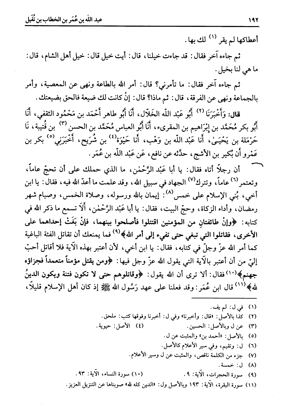 أعطاكها لم يقر (1) لك بها ثم جاءه آخر فقال قد جاءت خيلنا قال أيت خيل قال خيل أهل الشام قال ما هي لنا بخيل ثم جاءه آخر فقال ما تأمرني قال أمر الله بالطاعة ونهى عن المعصية وأمر بالجماعة ونهى عن الفرقة قال ثم ماذا قال إن كانت لك ضيعة فألحق بضيعتك قال وأخبرنا (2) أبو عبد الله الخلال أنا أبو طاهر أحمد بن محمود الثقفي أنا أبو بكر بن محمد بن إبراهيم بن المقرئ أنا أبو العباس محمد بن الحسن (3) بن قتيبة نا حرملة بن يحيى أنا عبد الله بن وهب أنا حيوة (4) بن شريح أخبرني (5) بكر بن عمرو أن بكير بن الأشج حدثه عن نافع عن عبد الله بن عمر أن رجلا أتاه فقال يا أبا عبد الرحمن ما الذي حملك على أن تحج عاما وتعتمر (6) عاما وتترك (7) الجهاد في سبيل الله وقد علمت ما أعد الله فيه فقال يا ابن أخي بني الإسلام على خمس (8) إيمان بالله ورسوله وصلاة الخمس وصيام شهر رمضان وأداء الزكاة وحج البيت فقال يا أبا عبد الرحمن ألا تسمع ما ذكر الله في كتابه " وإن طائفتان من المؤمنين أقتتلوا فأصلحوا بينهما فإن بغت إحداهما على الأخرى فقاتلوا التي تبغي حتى تفئ إلى أمر الله " (9) فما يمنعك أن تقاتل الفئة الباغية كما أمر الله عز وجل في كتابه فقال يا ابن أخي لأن أعتبر بهذه الآية فلا أقاتل أحب إلي من أن أعتبر بالآية التي يقول الله عز وجل فيها " ومن يقتل مؤمنا متعمدا فجزاؤه جهنم " (10) فقال ألا ترى أن الله يقول " وقاتلوهم حتى لا تكون فتنة ويكون الدين لله " (11) قال ابن عمر وقد فعلنا على عهد رسول الله (صلى الله عليه وسلم) يقول إذ كان أهل الإسلام قليلا