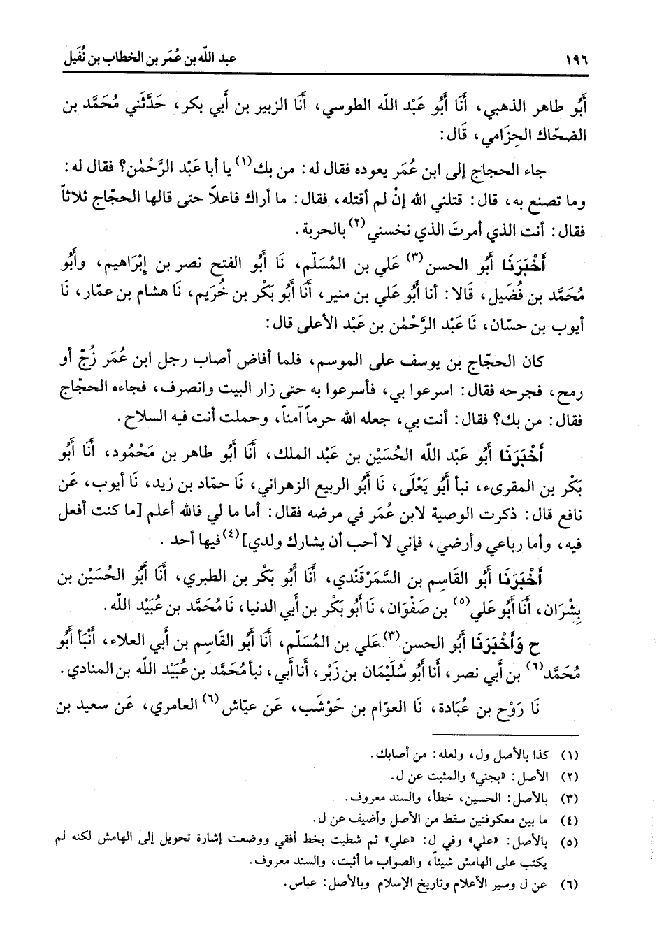 أبو طاهر الذهبي أنا أبو عبد الله الطوسي أنا الزبير بن أبي بكر حدثني محمد بن الضحاك الحزامي قال جاء الحجاج إلى ابن عمر يعوده فقال له من بك (1) يا أبا عبد الرحمن فقال له وما تصنع به قال قتلني الله إن لم أقتله فقال ما أراك فاعلا حتى قالها الحجاج ثلاثا فقال أنت الذي أمرت الذي نخسني (2) بالحربة أخبرنا أبو الحسن (3) علي بن مسلم نا أبو الفتح نصر بن إبراهيم وأبو محمد بن فضيل قالا أنا أبو علي بن منير أنا أبو بكر بن خريم نا هشام بن عمار نا أيوب بن حسان نا عبد الرحمن بن عبد الأعلى قال كان الحجاج بن يوسف على الموسم فلما أفاض أصاب رجل ابن عمر زج أو رمح فجرحه فقال أسرعوا بي فأسرعوا به حتى زار البيت وأنصرف فجاءه الحجاج فقال من بك فقال أنت بي جعله الله حرما آمنا وحملت أنت فيه السلاح أخبرنا أبو عبد الله الحسين بن عبد الملك أنا أبو طاهر بن محمود أنا أبو بكر بن المقرئ نبأ أبو يعلى نا أبو الربيع الزهراني نا حماد بن زيد نا أيوب عن نافع قال ذكرت الوصية لابن عمر في مرضه فقال أما مالي فالله أعلم ما كنت أفعل فيه وأما رباعي وأرضي فإني لا أحب أن يشارك ولدي (4) فيها أحد أخبرنا أبو القاسم بن السمرقندي أنا أبو بكر بن الطبري أنا أبو الحسين بن بشران أنا أبو علي (5) بن صفوان نا أبو بكر بن أبي الدنيا نا محمد بن عبيد الله ح وأخبرنا أبو الحسن (3) علي بن المسلم أنا أبو القاسم بن أبي العلاء أنبأ أبو محمد بن أبي نصر أنا أبو سليمان بن زبر أنا أبي نبأ محمد بن عبيد الله بن المنادي نا روح بن عبادة نا العوام بن حوشب عن عياش (6) العامري عن سعيد بن