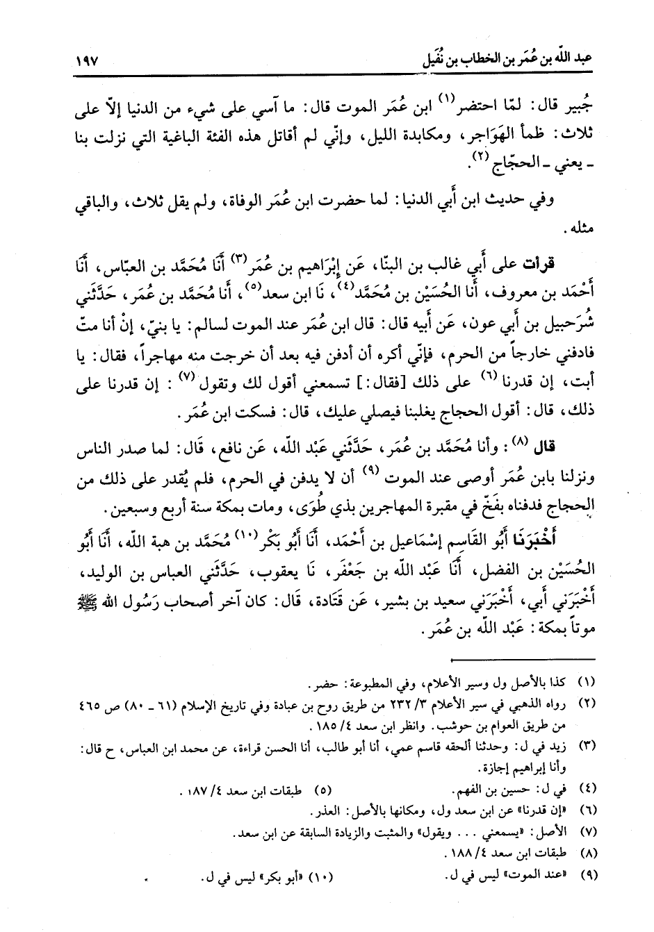 جبير قال لما أحتضر (1) ابن عمر الموت قال ما آسي على شئ من الدنيا إلا على ثلاث ظمأ الهواجر ومكابدة الليل وإني لم أقاتل هذه الفئة الباغية التي نزلت بنا يعني الحجاج (2) وفي حديث ابن أبي الدنيا لما حضرت ابن عمر الوفاة ولم يقل ثلاث والباقي مثله قرأت على أبي غالب بن البنا عن إبراهيم بن عمر (3) أنا محمد بن العباس أنا أحمد بن معروف أنا الحسين بن محمد (4) نا ابن سعد (5) أنا محمد بن عمر حدثني شرحبيل بن أبي عون عن أبيه قال قال ابن عمر عند الموت لسالم يا بني إن أنا مت فادفني خارجا من الحرم فإني أكره أن أدفن فيه بعد أن خرجت منه مهاجرا فقال يا أبت إن قدرنا (6) على ذلك فقال تسمعني أقول لك وتقول (7) إن قدرنا على ذلك قال أقول الحجاج يغلبنا فيصلي عليك قال فسكت ابن عمر قال (8) وأنا محمد بن عمر حدثني عبد الله عن نافع قال لما صدر الناس ونزلنا بابن عمر أوصى عند الموت (9) أن لا يدفن في الحرم فلم يقدر على ذلك من الحجاج فدفناه بفخ في مقبرة المهاجرين بذي طوى ومات بمكة سنة أربع وسبعين أخبرنا أبو القاسم إسماعيل بن أحمد أنا أبو بكر (10) محمد بن هبة الله أنا أبو الحسين بن الفضل أنا عبد الله بن جعفر نا يعقوب حدثني العباس بن الوليد أخبرني أبي أخبرني سعيد بن بشير عن قتادة قال كان آخر أصحاب رسول الله (صلى الله عليه وسلم) موتا بمكة عبد الله بن عمر