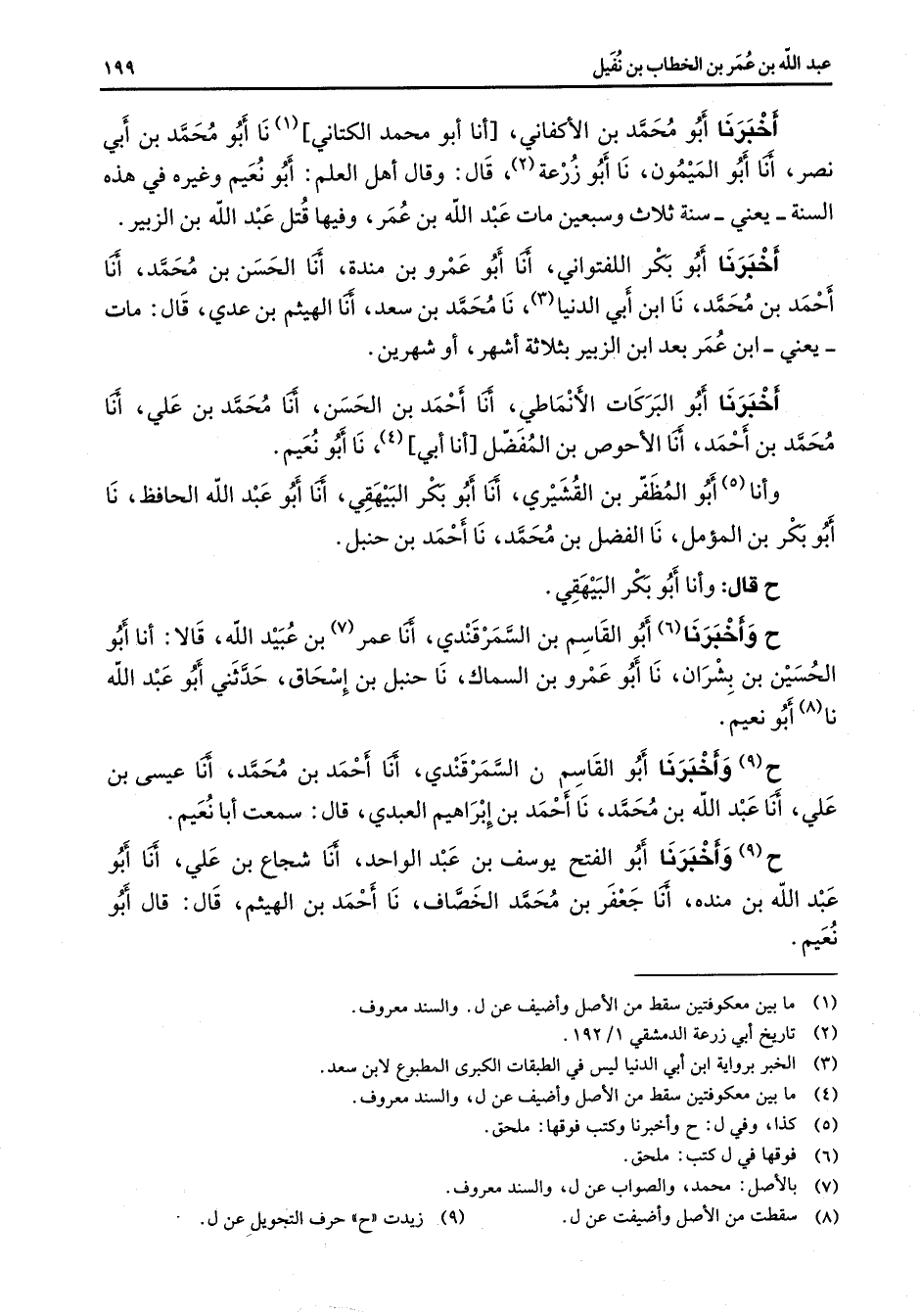 أخبرنا أبو محمد بن الأكفاني أنا أبو محمد الكتاني (1) نا أبو محمد بن أبي نصر أنا أبو الميمون نا أبو زرعة (2) قال وقال أهل العلم أبو نعيم وغيره في هذه السنة يعني سنة ثلاث وسبعين مات عبد الله بن عمر وفيها قتل عبد الله بن الزبير أخبرنا أبو بكر اللفتواني أنا أبو عمرو بن مندة أنا الحسن بن محمد أنا أحمد بن محمد نا ابن أبي الدنيا (3) نا محمد بن سعد أنا الهيثم بن عدي قال مات يعني ابن عمر بعد ابن الزبير بثلاثة أشهر أو شهرين أخبرنا أبو البركات الأنماطي أنا أحمد بن الحسن أنا محمد بن علي أنا محمد بن أحمد أنا الأحوص بن المفضل أنا أبي (4) نا أبو نعيم وأنا (5) أبو المظفر بن القشيري أنا أبو بكر البيهقي أنا أبو عبد الله الحافظ نا أبو بكر بن المؤمل نا الفضل بن محمد نا أحمد بن حنبل ح قال وأنا أبو بكر البيهقي ح وأخبرنا (6) أبو القاسم بن السمرقندي أنا عمر (7) بن عبيد الله قالا أنا أبو الحسين بن بشران نا أبو عمرو بن السماك نا حنبل بن إسحاق حدثني أبو عبد الله نا (8) أبو نعيم ح (9) وأخبرنا أبو القاسم بن السمرقندي أنا أحمد بن محمد أنا عيسى بن علي أنا عبد الله بن محمد نا أحمد بن إبراهيم العبدي قال سمعت أبا نعيم ح (9) وأخبرنا أبو الفتح يوسف بن عبد الواحد أنا شجاع بن علي أنا أبو عبد الله بن مندة أنا جعفر بن محمد الخصاف نا أحمد بن الهيثم قال قال أبو نعيم