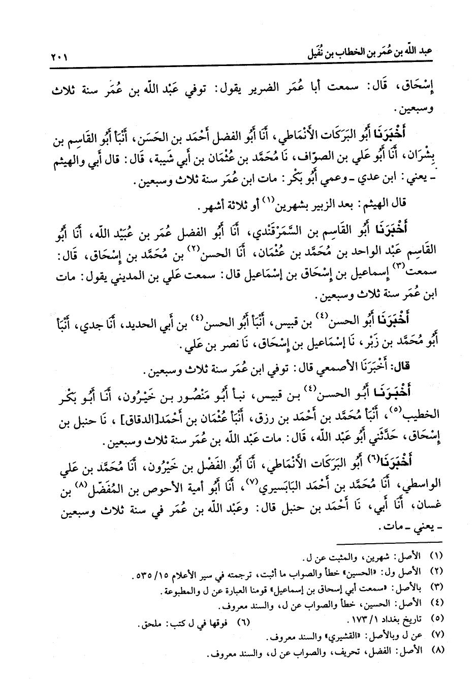 إسحاق قال سمعت ابا عمر الضرير يقول توفي عبد الله بن عمر سنة ثلاث وسبعين أخبرنا أبو البركات الأنماطي أنا أبو الفضل أحمد بن الحسن أنبأ أبو القاسم بن بشران أنا أبو علي بن الصواف نا محمد بن عثمان بن أبي شيبة قال قال أبي والهيثم يعني ابن عدي وعمي أبو بكر مات ابن عمر سنة ثلاث وسبعين قال الهيثم بعد الزبير بشهرين (1) أو ثلاثة أشهر أخبرنا أبو القاسم بن السمرقندي أنا أبو الفضل عمر بن عبيد الله أنا أبو القاسم عبد الواحد محمد بن عثمان أنا الحسن (2) بن محمد بن إسحاق قال سمعت (3) إسماعيل بن إسحاق بن إسماعيل قال سمعت علي بن المديني يقول مات ابن عمر سنة ثلاث وسبعين أخبرنا أبو الحسن (4) بن قبيس أنبأ أبو الحسن (4) ين أبي الحديد أنا جدي انبأ أبو محمد بن زبر نا إسماعيل بن إسحاق بن نصر بن علي قال أخبرنا الأصمعي قال توفي ابن عمر سنة ثلاث وسبعين أخبرنا أبو الحسن (4) بن قبيس نبأ أبو منصور بن خيرون أنا أبو بكر الخطيب (5) أنبأ محمد بن أحمد بن رزق أنبأ عثمان بن أحمد الدقاق نا حنبل بن إسحاق حدثني أبو عبد الله قال مات عبد الله بن عمر سنة ثلاث وسبعين أخبرنا (6) أبو البركات الأنماطي أنا أبو الفضل بن خيرون أنا محمد بن علي الواسطي أنا محمد بن أحمد البابسيري (7) أنا أبو أمية الأحوص بن المفضل (8) بن غسان أنا أبي نا أحمد بن حنبل قال وعبد الله بن عمر في سنة ثلاث وسبعين يعني مات