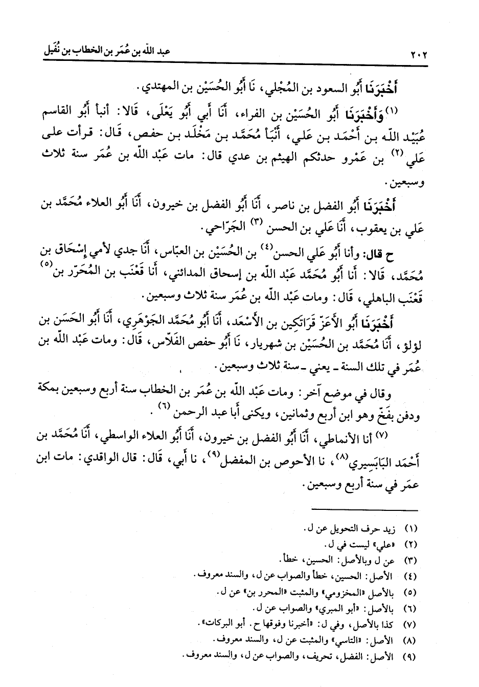 أخبرنا أبو السعود بن المجلي نا أبو الحسين بن المهتدي (1) وأخبرنا أبو الحسين بن الفراء أنا أبي أبو يعلى قالا أنبأ أبو القاسم عبيد الله بن أحمد بن علي أنبأ محمد بن مخلد بن حفص قال قرأت على علي (2) بن عمرو حدثكم الهيثم بن عدي قال مات عبد الله بن عمر سنة ثلاث وسبعين أخبرنا أبو الفضل بن ناصر أنا أبو الفضل بن خيرون أنا أبو العلاء محمد بن علي بن يعقوب أنا علي بن الحسن (3) الجراحي ح قال وأنا أبو علي الحسن (4) بن الحسين بن العباس أنا جدي لأمي إسحاق بن محمد قالا أنا أبو محمد عبد الله بن إسحاق المدائني أنا قعنب بن المحرر بن (5) قعنب الباهلي قال ومات عبد الله بن عمر سنة ثلاث وسبعين أخبرنا أبو الأعز قراتكين بن الأسعد أنا أبو محمد الجوهري أنا أبو الحسن بن لؤلؤ أنا محمد بن الحسين بن شهريار نا أبو حفص الفلاس قال ومات عبد الله بن عمر في تلك السنة يعني سنة ثلاث وسبعين وقال في موضع آخر ومات عبد الله بن عمر بن الخطاب سنة أربع وسبعين بمكة ودفن بفخ وهو ابن أربع وثمانين ويكنى ابا عبد الرحمن (6) (7) أنا الأنماطي أنا أبو الفضل بن خيرون أنا أبو العلاء الواسطي أنا محمد بن أحمد البابسري (8) نا الأحوص بن المفضل (9) نا أبي قال قال الواقدي مات ابن عمر في سنة أربع وسبعين