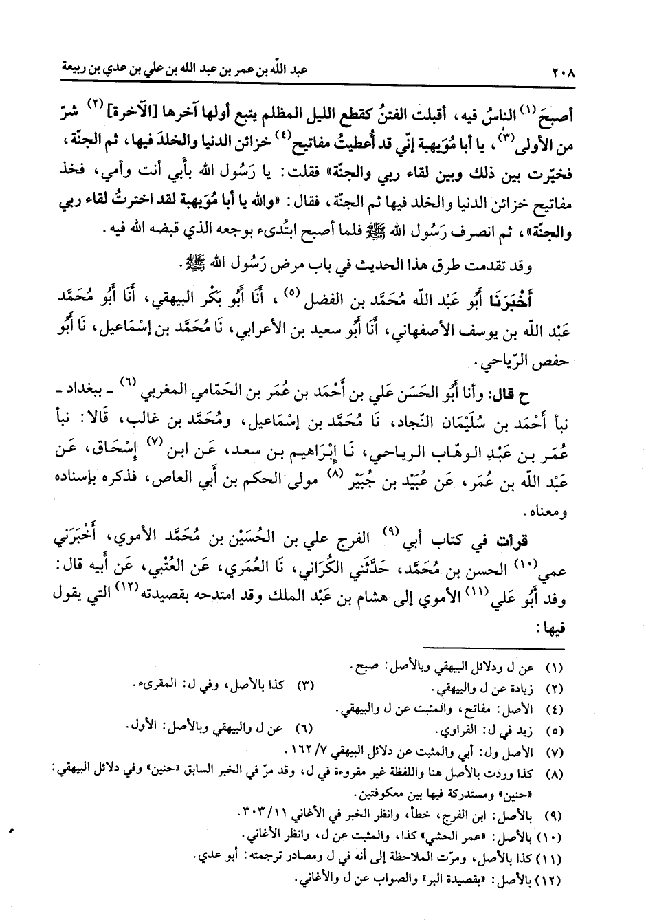 أصبح (1) الناس فيه أقبلت الفتن كقطع الليل المظلم يتبع أولها آخرها الآخرة (2) شر من الأولى (3) يا أبا مويهبة إني قد أعطيت مفاتيح (4) خزائن الدنيا والخلد فيها ثم الجنة فخيرت بين ذلك وبين لقاء ربي والجنة ح فقلت يا رسول الله بابي أنت وأمي فخذ مفاتيح خزائن الدنيا والخلد فيها ثم الجنة فقال والله يا أبا مويهبة لقد اخترت لقاء ربي والجنة ثم انصرف رسول الله (صلى الله عليه وسلم) فلما أصبح ابتدئ بوجعه الذي قبضه الله فيه وقد تقدمت طرق هذا الحديث في باب مرض رسول الله (صلى الله عليه وسلم) أخبرنا أبو عبد الله محمد بن الفضل (5) أنا أبو بكر البيهقي أنا أبو محمد عبد الله بن يوسف الأصفهاني أنا أبو سعيد بن الأعرابي نا محمد بن إسماعيل نا أبو حفص الرياحي ح قال وأنا أبو الحسن علي بن أحمد بن عمر بن الحمامي المغربي (6) ببغداد نبأ أحمد بن سليمان النجاد نا محمد بن إسماعيل ومحمد بن غالب قالا نبأ عمر بن عبد الوهاب الرياحي نا إبراهيم بن سعد عن ابن (7) إسحاق عن عبد الله بن عمر عن عبيد بن جبير (8) مولى الحكم بن أبي العاص فذكره بإسناده ومعناه قرأت في كتاب أبي (9) الفرج علي بن الحسين بن محمد الأموي أخبرني عمي (10) الحسن بن محمد حدثني الكراني نا العمري عن العتيبي عن أبيه قال وفد أبو علي (11) الأموي إلى هشام بن عبد الملك وقد امتدحه بقصيدته (12) التي يقول فيها