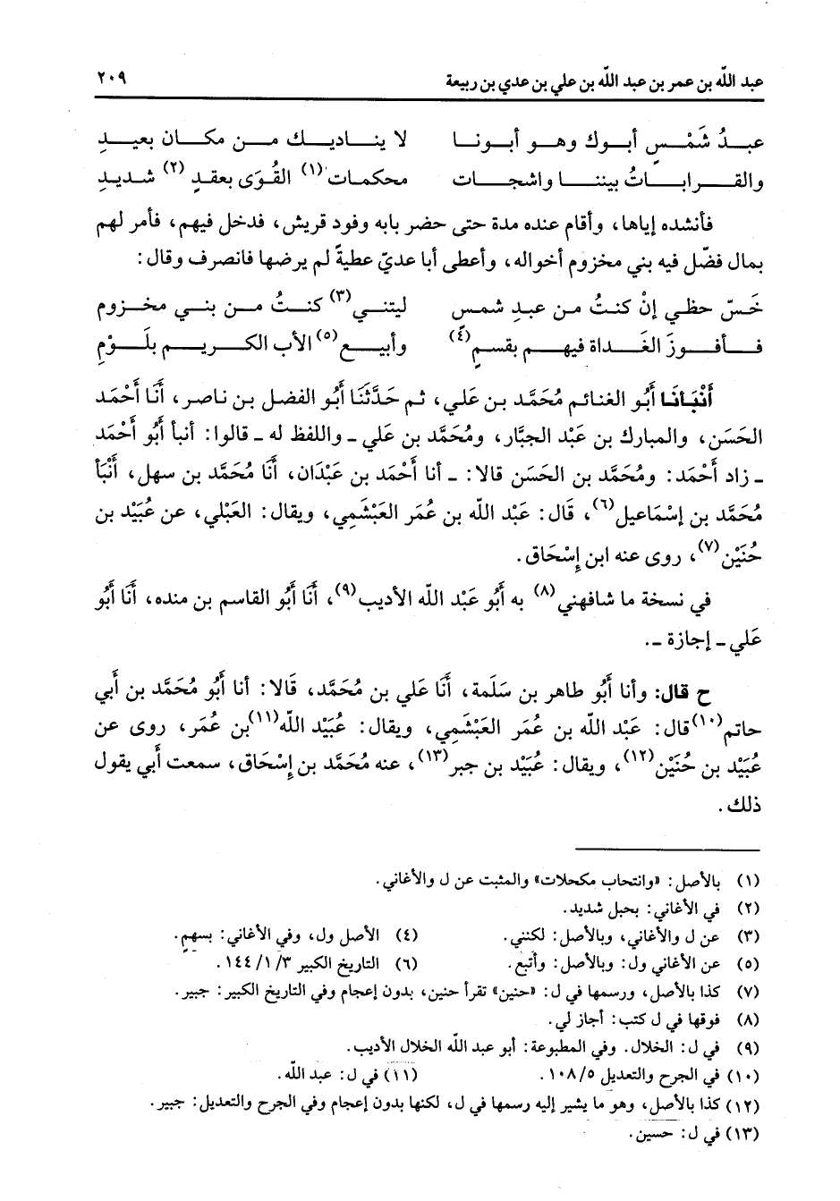 * عبد شمس أبوك وهو أبونا * لا يناديك من مكان بعيد والقرابات بيننا واشجات * محكمات (1) القوي بعقد (2) شديد * فأنشده إياها وأقام عنده مدة حتى حضر بابه وفود قريش فدخل فيهم فأمر لهم بمال فضل فيه بني مخزوم أخواله وأعطى ابا عدي عطية لم يرضها فانصرف وقال * خس حظي إن كنت من عبد شمس * ليتني (3) كنت من بني مخزوم فأفوز الغداة فيهم بقسم (4) * وأبيع (5) الأب الكريم بلوم * أنبأنا أبو الغنائم محمد بن علي ثم حدثنا أبو الفضل بن ناصر أنا أحمد الحسن والمبارك بن عبد الجبار ومحمد بن علي واللفظ له قالوا أنبأ أبو أحمد زاد أحمد ومحمد بن الحسن قالا أنا أحمد بن عبدان أنا محمد بن سهل أنبأ محمد بن إسماعيل (6) قال عبد الله بن عمر العبشمي ويقال العبلي عن عبيد بن حنين (7) روى عنه ابن إسحاق في نسخة ما شافهني (8) به أبو عبد الله الأديب (9) أنا أبو القاسم بن منده أنا أبو علي إجازة ح قال وأنا أبو طاهر بن سلمة أنا علي بن محمد قالا أنا أبو محمد بن أبي حاتم (10) قال عبد الله بن عمر العبشمي ويقال عبيد الله (11) بن عمر روى عن عبيد بن حنين (12) ويقال عبيد بن جبر (13) عنه محمد بن إسحاق سمعت أبي يقول ذلك