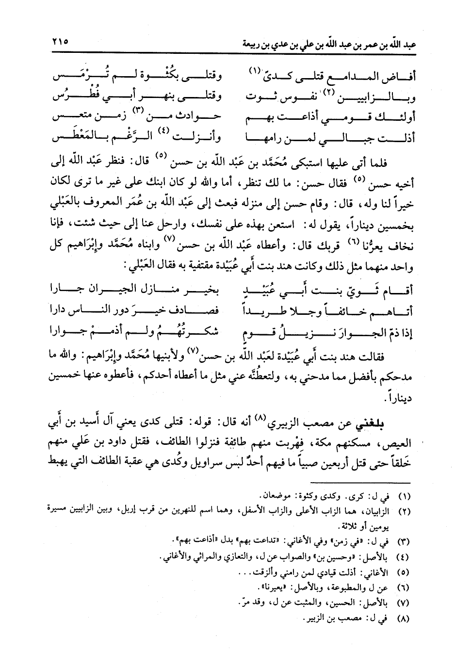 أفاض المدامع قتلى كدى (1) * وقتلى بكثوة لم ترمس وبالزابيين (2) نفوس ثوت * وقتلى بنهر أبي فطرس أولئك قومي أذاعت بهم * حوادث من (3) زمن متعس أذلت جبالي لمن رامها * وأنزلت (4) الرغم بالمعطس * فلما أتى استبكى محمد بن عبد الله بن حسن (5) قال فنظر عبد الله إلى أخيه حسن (5) فقال حسن مالك تنظر أما والله لو كان ابنك على غير ما ترى لكان خيرا لنا وله قال وقام حسن إلى منزله فبعث إلى عبد الله بن عمر المعروف بالعبلي بخمسين دينارا يقول له استعن بهذه على نفسك وارحل عنا إلى حيث شئت فإنا نخاف يعرنا (6) قربك قال وأعطاه عبد الله بن حسن (7) وابناه محمد وإبراهيم كل واحد منهما مثل ذلك وكانت هند بنت أبي عبيدة مقتفية به فقال العبلي * أقام ثوي بنت أبي عبيد * بخير منازل الجيران جارا أتاهم خائفا وجلا طريدا * فصادف خير دور الناس دارا إذا ذم الجوار نزيل قوم * شكرتهم ولم أذمم جوارا * فقالت هند بنت أبي عبيدة لعبد الله بن حسن (7) ولأبنيها محمد وإبراهيم والله ما مدحكم بأفضل مما مدحني به لتطعنه عني مثل ما اعطاه أحدكم فأعطوه عنها خمسين دينارا بلغني عن مصعب الزبيري (8) أنه قال قوله قتلى كدى يعني آل أسيد بن أبي العيص مسكنهم مكة فهربت منهم طائفة فنزلوا الطائف فقتل داود بن علي منهم خلقا حتى قتل أربعين صبيا ما فيهم أحد لبس سراويل وكدى هي عقبة الطائف التي يهبط