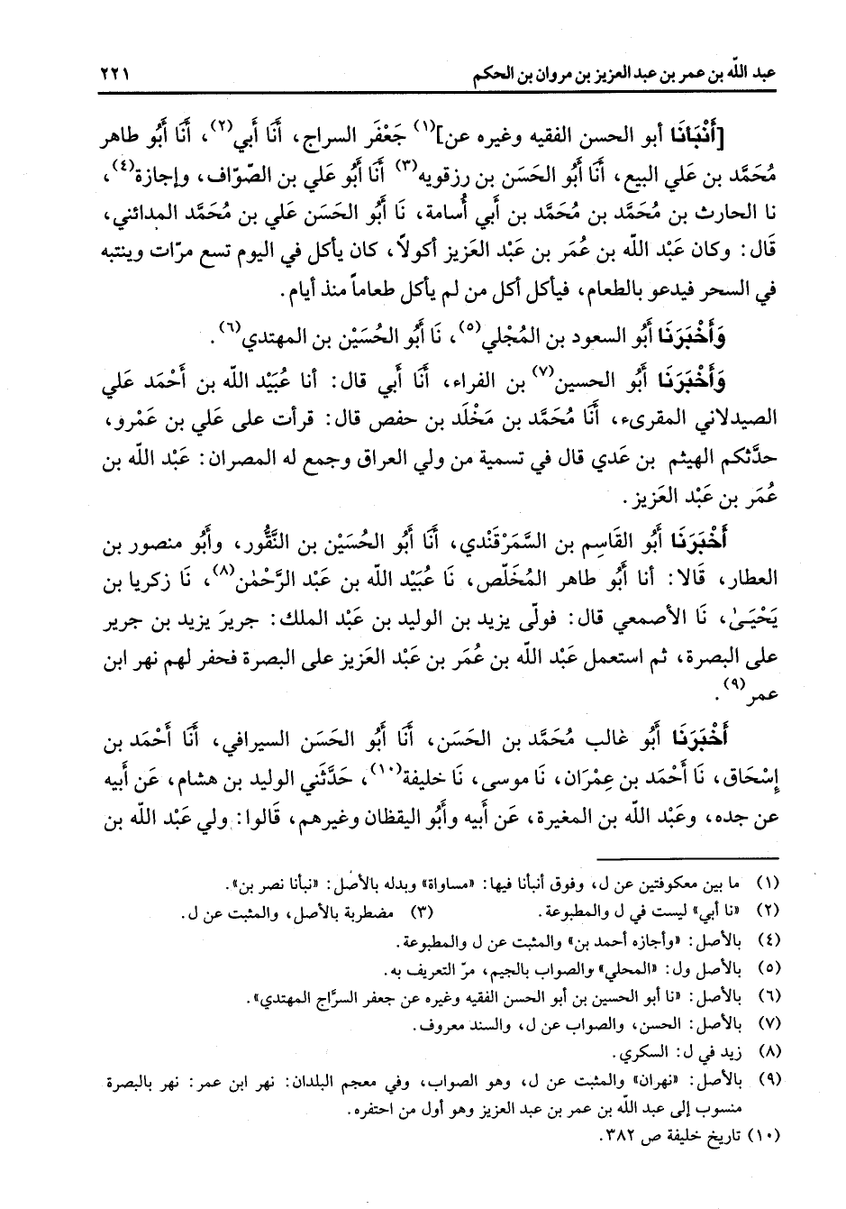أنبأنا أبو الحسن الفقيه وغيره عن (1) جعفر السراج أنا أبي (2) أنا أبو طاهر محمد بن علي البيع أنا أبو الحسن بن رزقوية (3) أنا أبو علي بن الصواف وإجازة (4) نا الحارث بن محمد بن محمد بن أبي أسامة نا أبو الحسن علي بن محمد المدائني قال وكان عبد الله بن عمر بن عبد العزيز أكولا كان يأكل في اليوم تسع مرات وينتبه في السحر فيدعو بالطعام فيأكل أكل من لم ياكل طعاما منذ أيام وأخبرنا أبو السعود بن المجلي (5) نا أبو الحسين بن المهتدي (6)