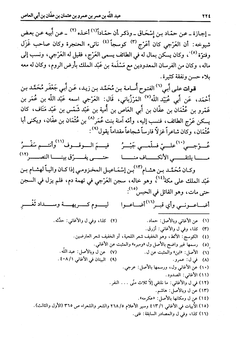إجازة عن حماد بن إسحاق وذكر أن حمادا (1) أخذه (2) عن أبيه عن بعض شيوخه أن العرجي كان أعرج (3) كوسجا (4) ناتئ الحنجرة وكان صاحب غزل وفتوة (5) وكان يسكن بمال له في الطائف يسمى العرج فقيل له العرجي ونسب إلى ماله وكان من الفرسان المعدودين مع مسلمة بن عبد الملك بأرض الروم وكان له معه بلاء حسن ونفقة كثيرة قرأت على أبي (6) الفتوح أسامة بن محمد بن زيد عن أبي جعفر محمد بن أحمد عن أبي عبيد الله (7) المرزباني قال العرجي اسمه عبد الله بن عمر بن عمرو بن عثمان بن عفان بن أبي العاص بن أمية بن عبد شمس بن عبد مناف كان يسكن عرج الطائف فنسب إليه وأمه آمنة بنت عمر (8) بن عثمان بن عفان ويكنى أبا عثمان وكان شاعرا غزلا فارسا شجاعا مقداما يقول (9) * عوجي (10) علي فسلمي جبر * فيم الوقوف (11) وأنتم سفر ما يلتقي الأنكاف منا * حتى يفرق بيننا النصر * (12) وكان محمد بن هشام (13) بن إسماعيل المخزومي إذا كان واليا لهشام بن عبد الملك على مكة (14) وهو خاله سجن العرجي في تهمة دم فلم يزل في السجن حتى مات وهو القائل في الحبس (15) * أضاعوني وأي قبر (16) اضاعوا * ليوم كريهة وسداد ثغر