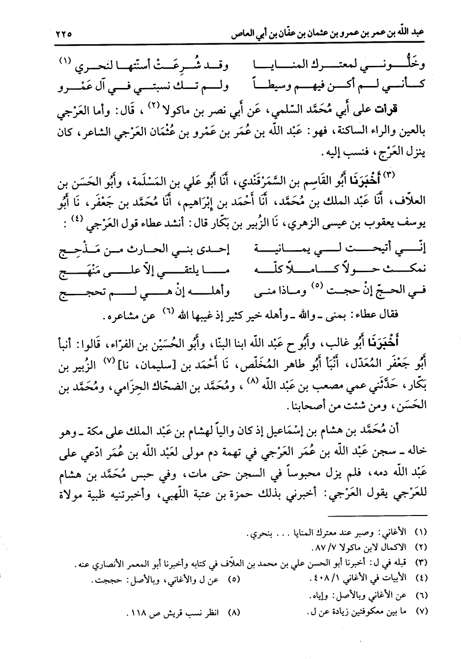 وخلوني لمعترك المنايا * وقد شرعت أسنتها لنحري (1) كأني لم أكن فيهم وسيطا * ولم تك نسبتي في آل عمرو * قرأت على أبي محمد السلمي عن أبي نصر بن ماكولا (2) قال وأما العرجي بالعين والراء الساكنة فهو عبد الله بن عمر بن عمرو بن عثمان العرجي الشاعر كان ينزل العرج فنسب إليه (3) أخبرنا أبو القاسم بن السمرقندي أنا أبو علي بن المسلمة وأبو الحسن بن العلاف أنا عبد الملك بن محمد أنا أحمد بن إبراهيم أنا محمد بن جعفر نا أبو يوسف يعقوب بن عيسى الزهري نا الزبير بن بكار قال أنشد عطاء قول العرجي (4) * إني أتيحت لي يمانية إحدى بني الحارث من مذحج نمكث حولا كاملا كله * ما يلتقي إلا على منهج في الحج إن حجت (5) وماذا مني * وأهله إن هي لم تحج * فقال عطاء بمنى والله وأهله خير كثير إذا غيبها الله (6) عن مشاعره أخبرنا أبو غالب وأبو عبد الله ابنا البنا وأبو الحسين بن الفراء قالوا أنبأ أبو جعفر المعدل أنبأ أبو طاهر المخلص نا أحمد بن سليمان نا (7) الزبير بن بكار حدثني عمي مصعب بن عبد الله (8) ومحمد بن الضحاك الحزامي ومحمد بن الحسن ومن شئت من أصحابنا أن محمد بن هشام بن إسماعيل إذ كان واليا لهشام بن عبد الملك على مكة وهو خاله سجن عبد الله بن عمر العرجي في تهمة دم مولى لعبد الله بن عمر ادعى على عبد الله دمه فلم يزل محبوسا في السجن حتى مات وفي حبس محمد بن هشام للعرجي يقول العرجي أخبرني بذلك حمزة بن عتبة اللهبي وأخبرتنيه ظبية مولاة