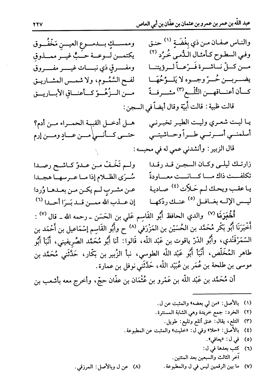 والناس صفان من ذي بغضة (1) حنق * وممسك بدموع العين مخفوق وفي السطوح كأمثال الدمى خرد (2) * يكتمن لوعة حب غير ممذوق من كل ناشرة فرعا لرؤيتنا * ومفرق ذي نبات غير مفروق يضربن حر وجوه لا يلوحها * لفح السموم ولا شمس المشاريق كأن أعناقهن التلع (3) مشرفة * من الزهور كأعناق الأباريق * قالت ظبية قالت أبية وقال أيضا في السجن * يا ليت شعري وليت الطير تخبرني * هل أدخل القبة الحمراء من أدم * أسلمني أسرتي طرا وحاشيتي * حتى كاني من عاد ومن إرم * قال الزبير وأنشدني عمي له في محبسه * زارتك ليلى وكان السجن قد رقدا * ولم تخف من عدو كاشح رصدا تكلفت ذاك ما كانت معاودة * سرى الظلام إذا ما عرسها هجدا يا عقب ويحك لم حلأت (4) صادية * عن مشرب لم يكن من بعدها وردا ليس الإله بغافل (5) عنك ردكها * إن عذب الله ممن قد برا أحدا * (6) أخبرنا (7) والدي الحافظ أبو القاسم علي بن الحسن رحمه الله قال أخبرنا أبو بكر محمد بن الحسين بن المزرفي (8) وأبو القاسم إسماعيل بن أحمد بن السمرقندي وأبو الدر ياقوت بن عبد الله قالوا أنا أبو محمد الصريفيني أنبأ أبو طاهر المخلص أنبأ أبو عبد الله الطوسي نبأ الزبير بن بكار حدثني محمد بن موسى بن طلحة بن عمر بن عبيد الله حدثني نوفل بن عمارة أن محمد بن عبد الله بن عمرو بن عثمان بن عفان حج وأخرج معه بأشعب بن