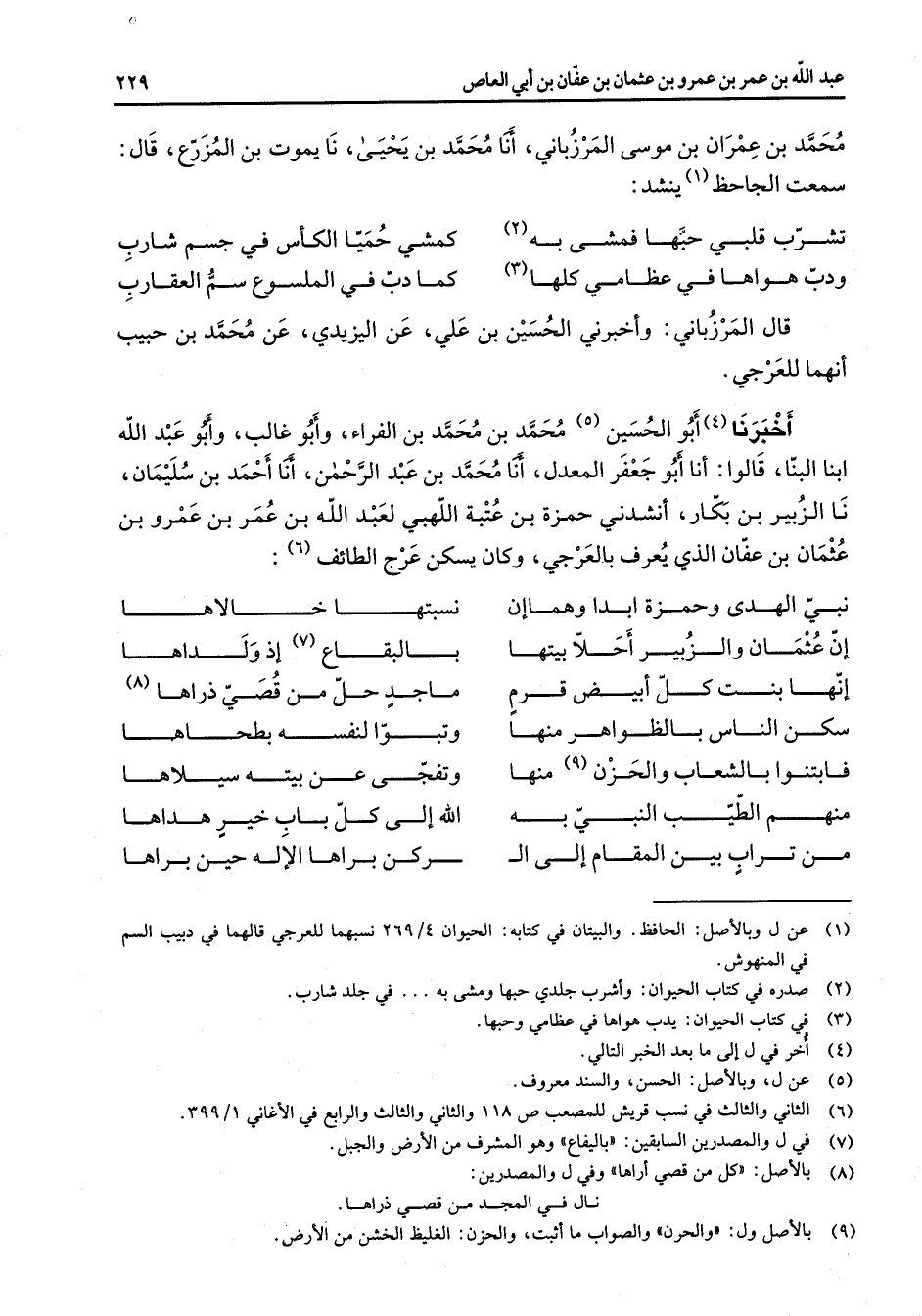 محمد بن عمران بن موسى المرزباني أنا محمد بن يحيى نا يموت بن المزرع قال سمعت الجاحظ (1) ينشد * تشرب قلبي حبها فمشى به (2) * كمشي حميا الكأس في جسم شارب ودب هواها في عظامي كلها (3) * كما دب في الملسوع سم العقارب * قال المرزباني وأخبرني الحسين بن علي عن اليزيدي عن محمد بن حبيب انهما للعرجي أخبرنا (4) أبو الحسين (5) محمد بن محمد بن الفراء وأبو غالب وأبو عبد الله ابنا البنا قالوا أنا أبو جعفر المعدل أنا محمد بن عبد الرحمن أنا أحمد بن سليمان نا الزبير بن بكار أنشدني حمزة بن عتبة اللهبي لعبد الله بن عمر بن عمرو بن عثمان بن عفان الذي يعرف بالعرجي وكان يسكن عرج الطائف (6) * نبي الهدى وحمزة أبدا وهما إن * نسبتها خالاها إن عثمان والزبير أحلا بيتها * بالبقاع (7) إذ ولداها إنها بنت كل أبيض قرم * ماجد حل من قصي ذراها (8) سكن الناس بالظواهر منها * وتبوا لنفسه بطحاها فابتنوا بالشعاب والحزن (9) منها * وتفجى عن بيته سيلاها منهم الطيب النبي به * الله إلى كل باب خير هداها * من تراب بين المقام إلى ال * ركن براها الإله حين براها